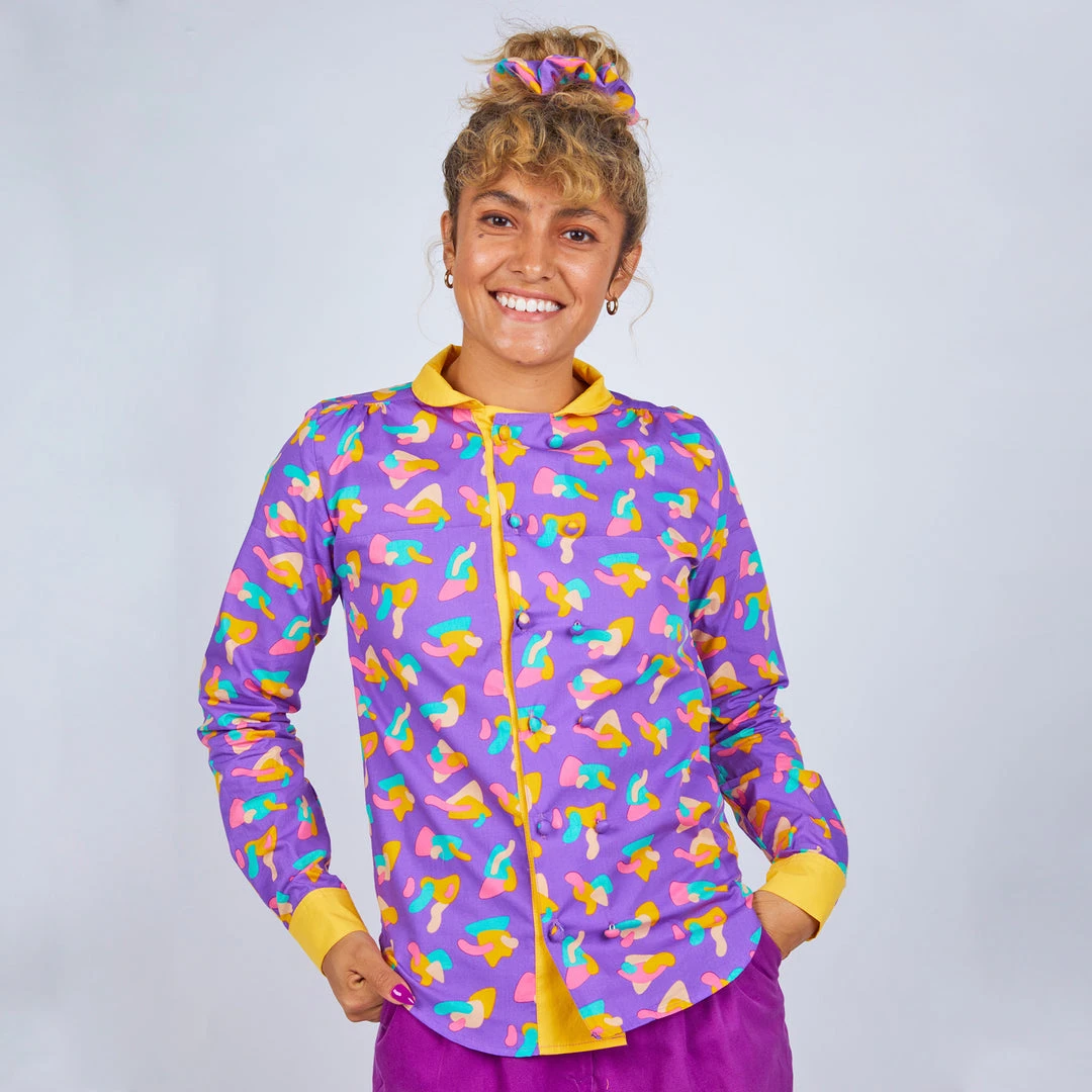 Choose your style with our new long sleeve button up blouse. Featuring a double breasted placket that functions both ways. Pick your look by choosing to contrast your placket or blend with the body color. This style is perfect for both dressy and casual affairs. Close it up with 3D fabric covered contrast buttons! Prepare to turn heads in this rad top!