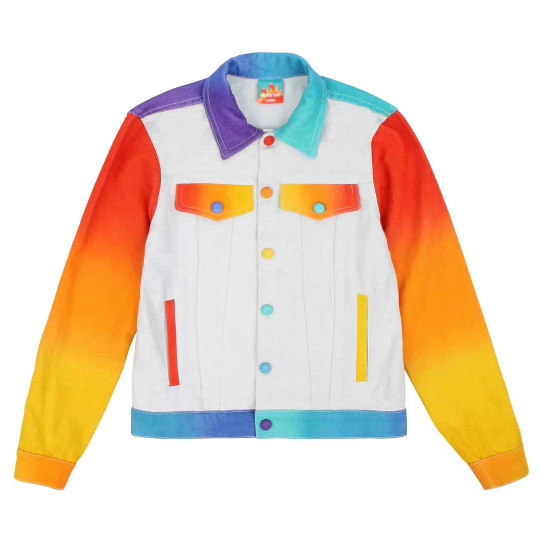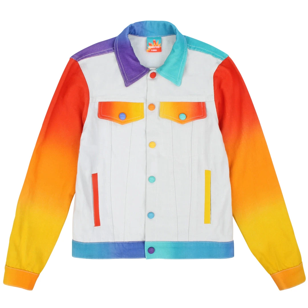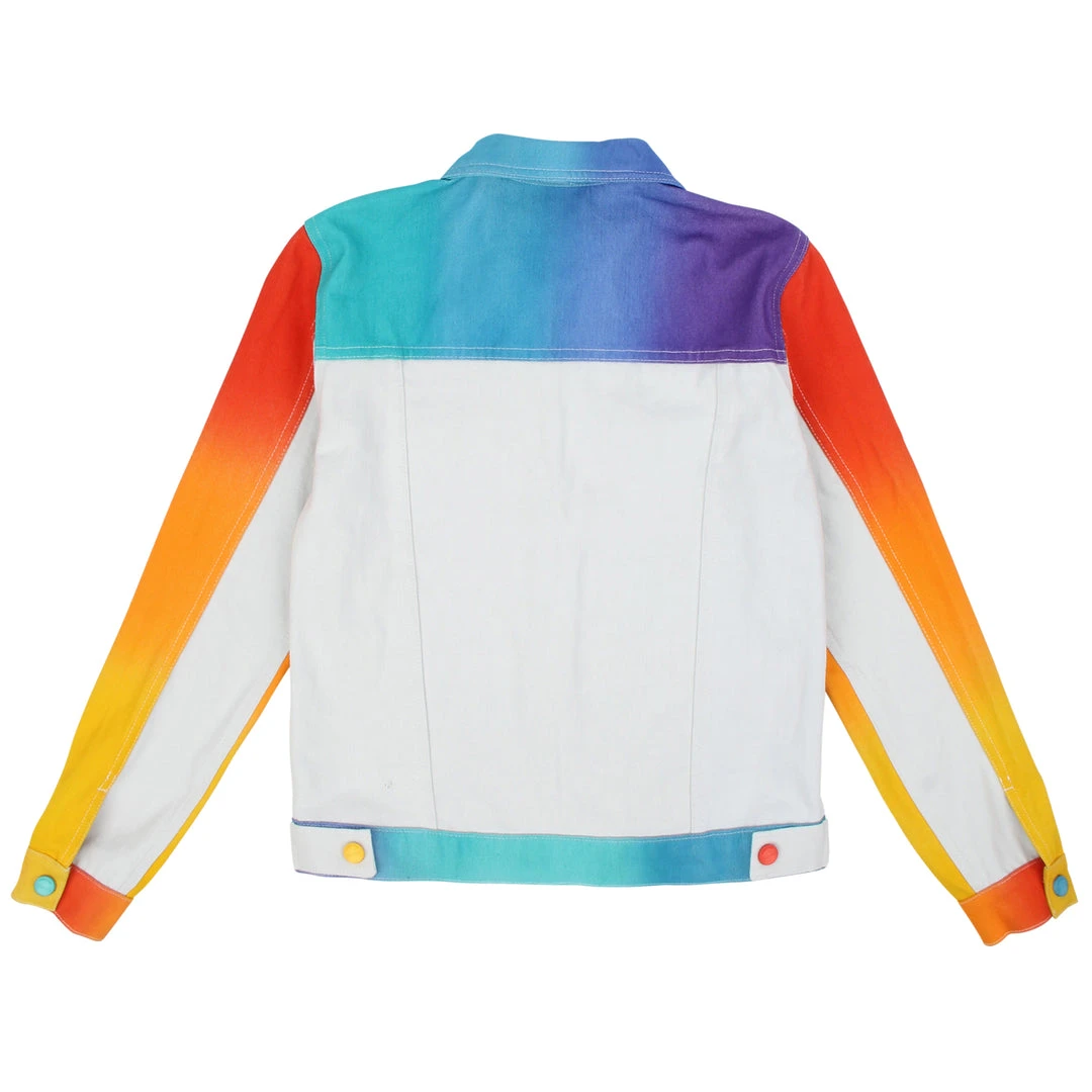 Our airbrush denim jackets are back! Hand airbrushed by piece for an amazing spectrum blend effect with a solid contrast light grey dyed base. Features two front welt pockets, two chest snap flap pockets, and inside pockets with illustrated tag!