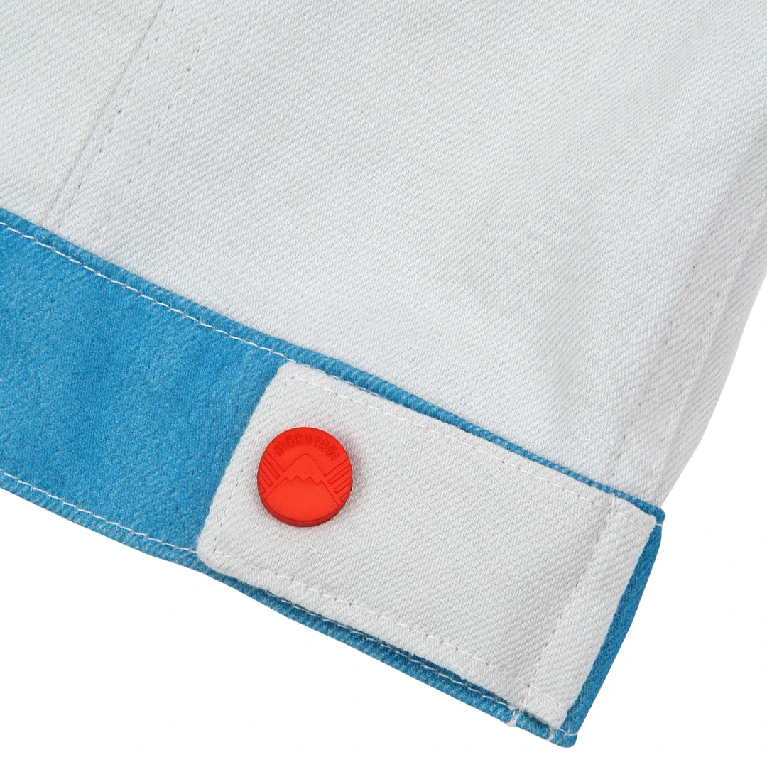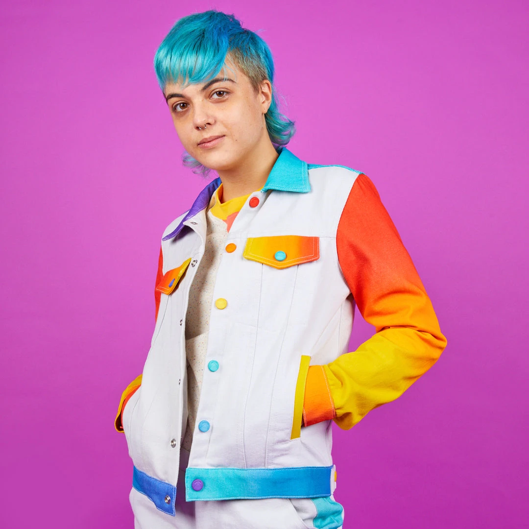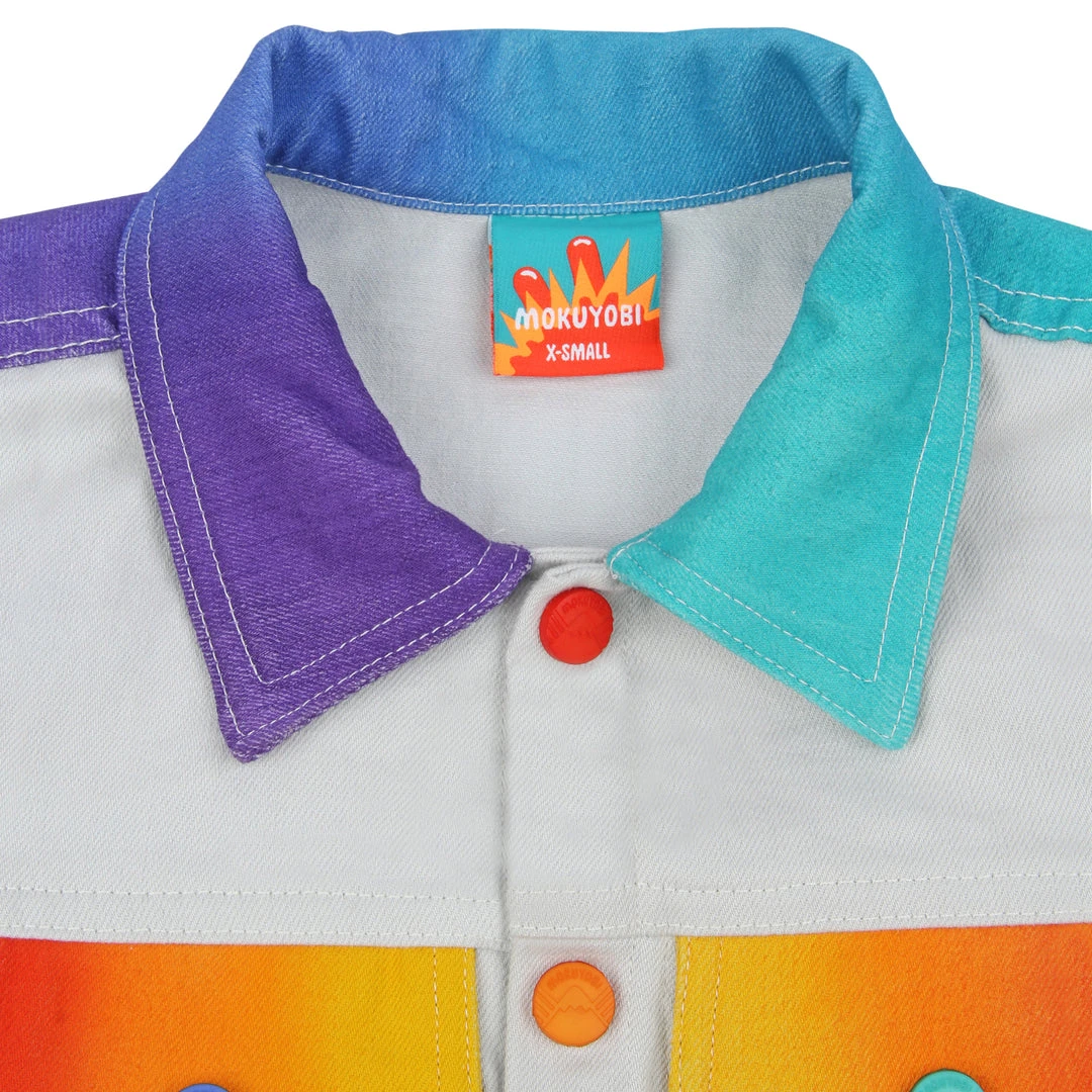 Our airbrush denim jackets are back! Hand airbrushed by piece for an amazing spectrum blend effect with a solid contrast light grey dyed base. Features two front welt pockets, two chest snap flap pockets, and inside pockets with illustrated tag!