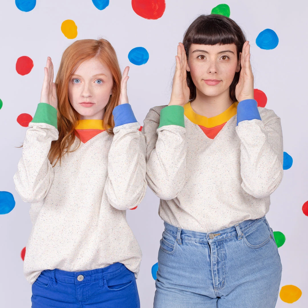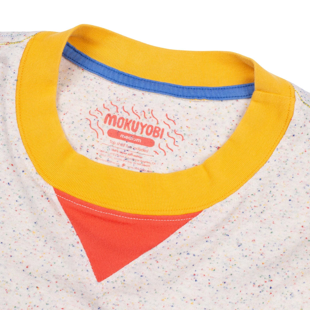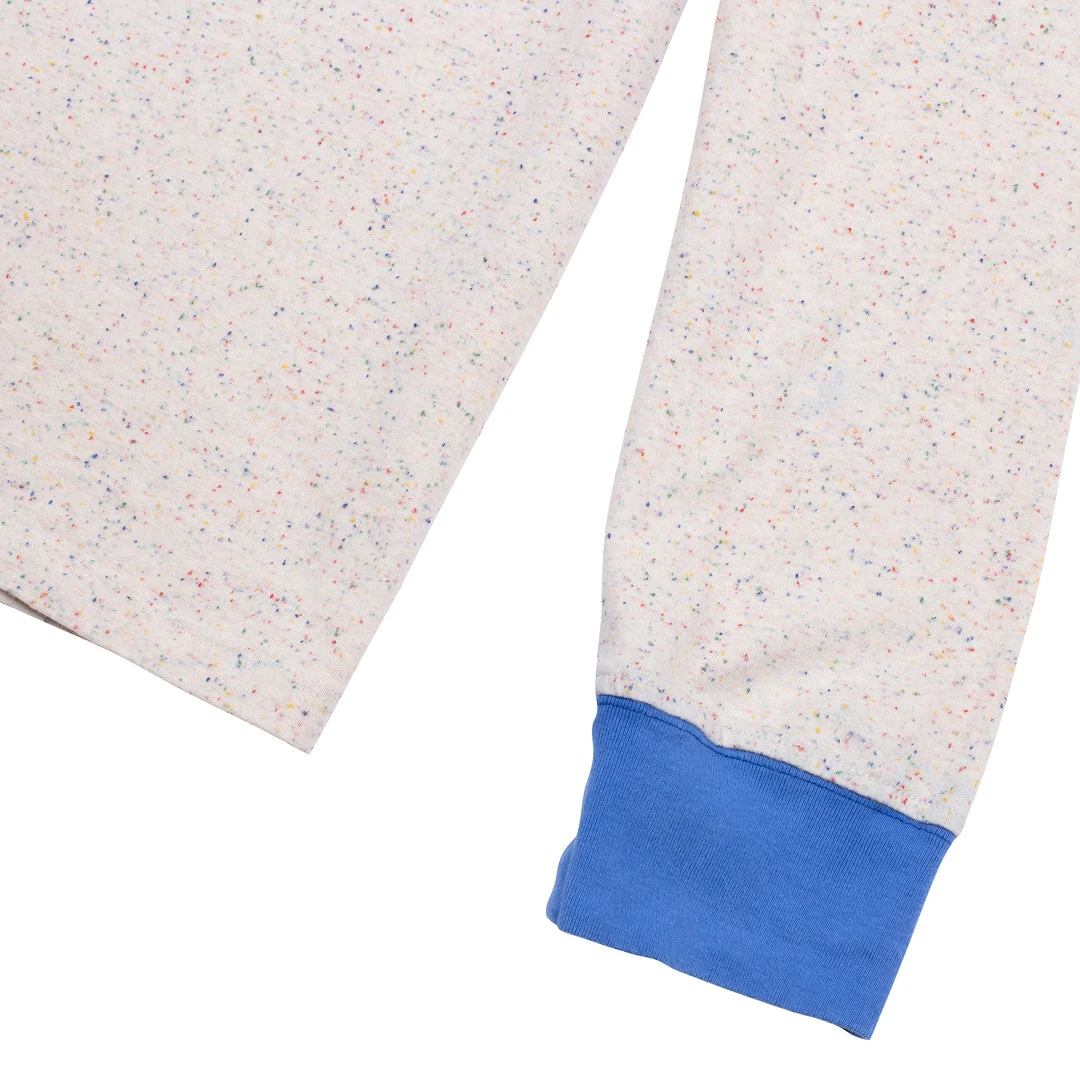 A fun basic that you’ll need to add to your rotation ASAP. Custom dyed to match rib, color block neck detail, and sleeve cuffs all paired with a fun primary speckle jersey fabric base.