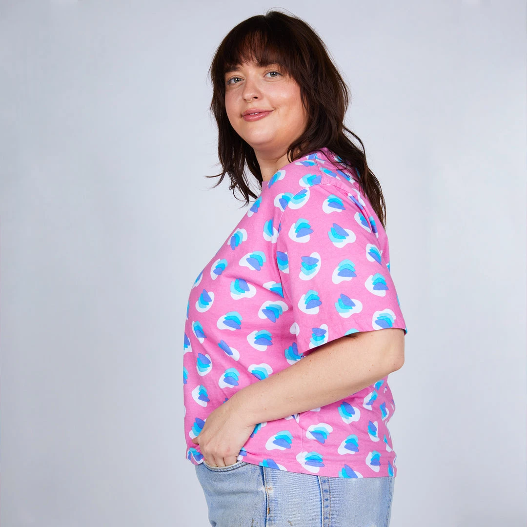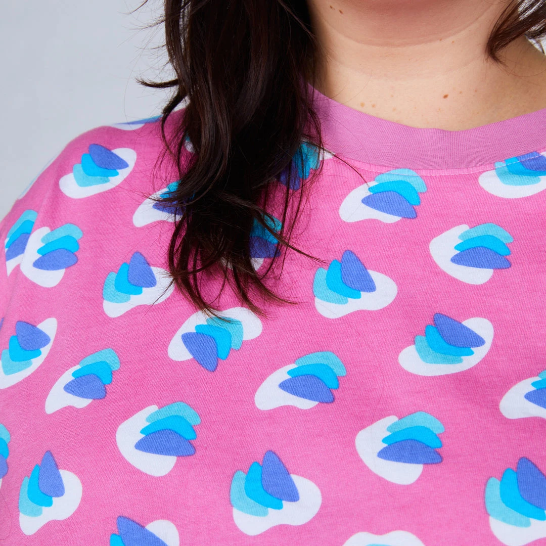 Super soft light pink base tee with allover print and match rib.