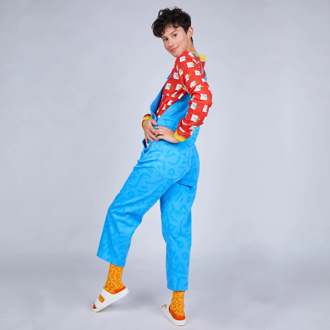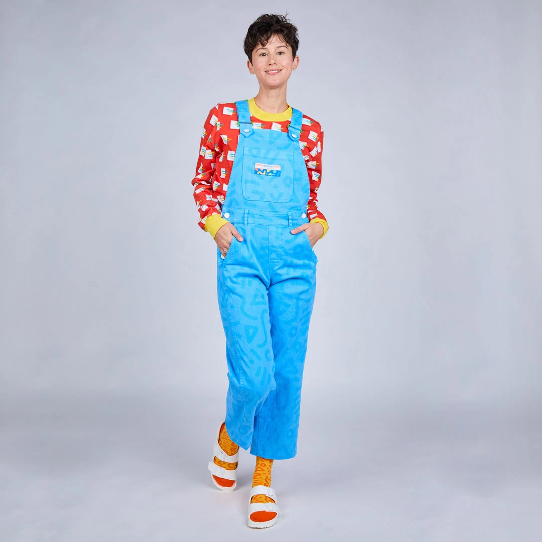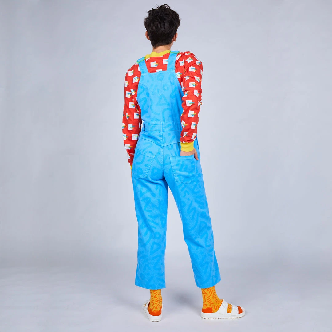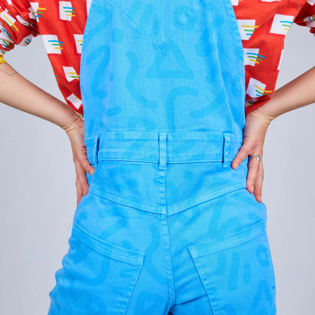 Overalls for all! This totally rad print style with a light blue background will have you ready for anything! The stretch fabric make this style super comfortable and easy to move in. Features a large front chest pocket, two front pockets, two back pockets, belt loops, adjustable straps, and secure rubberized tack button closures.