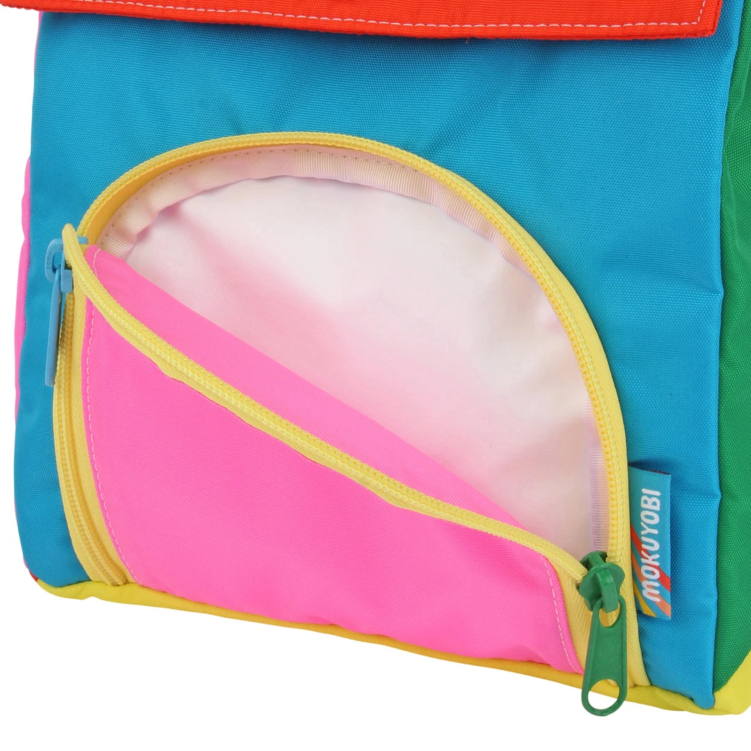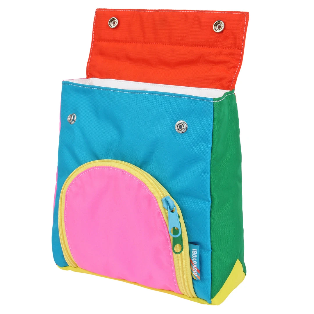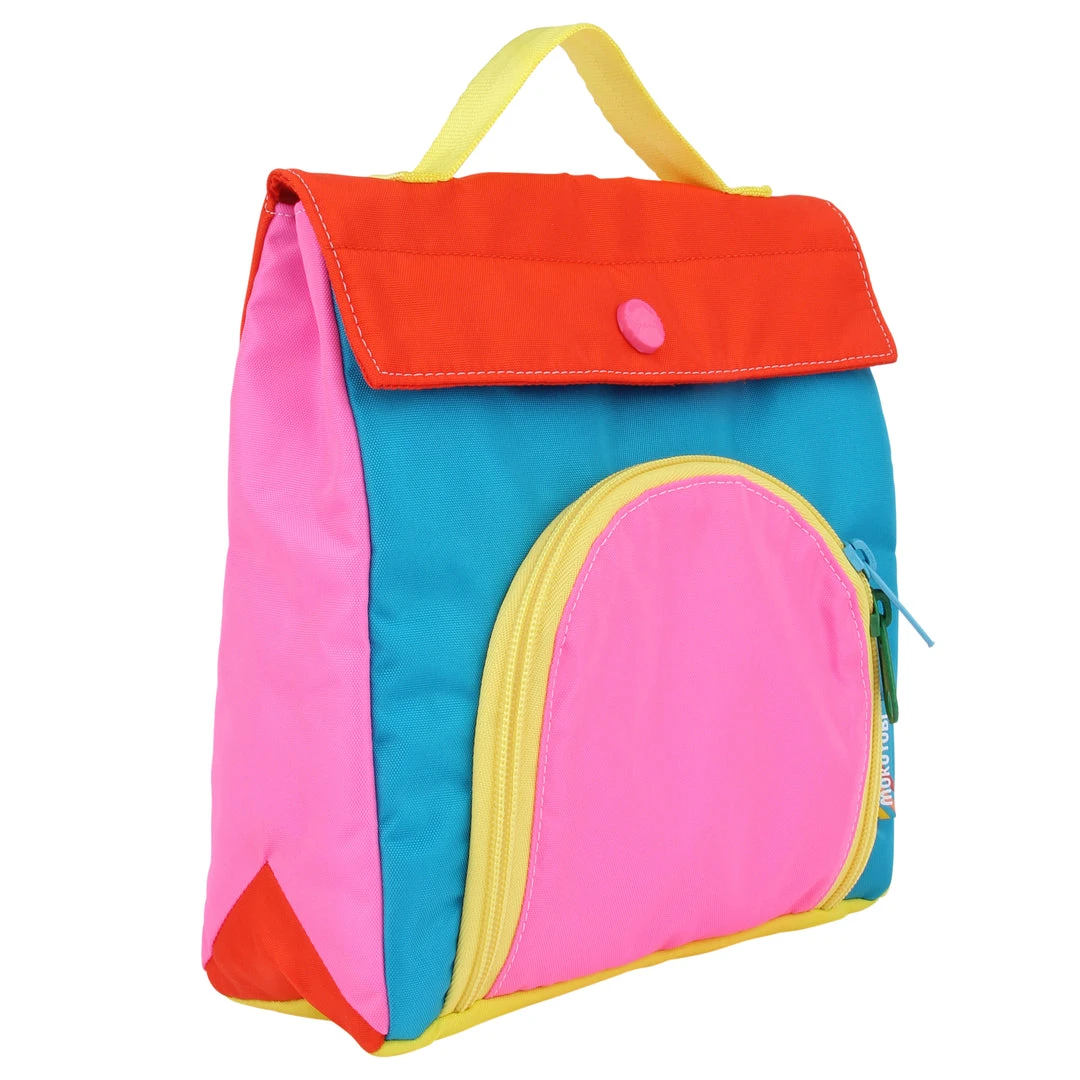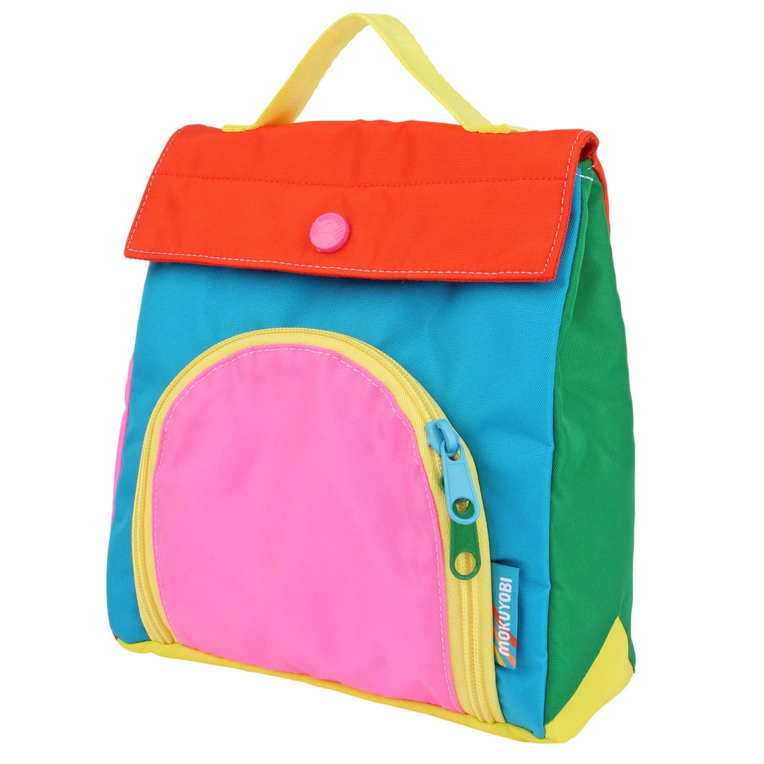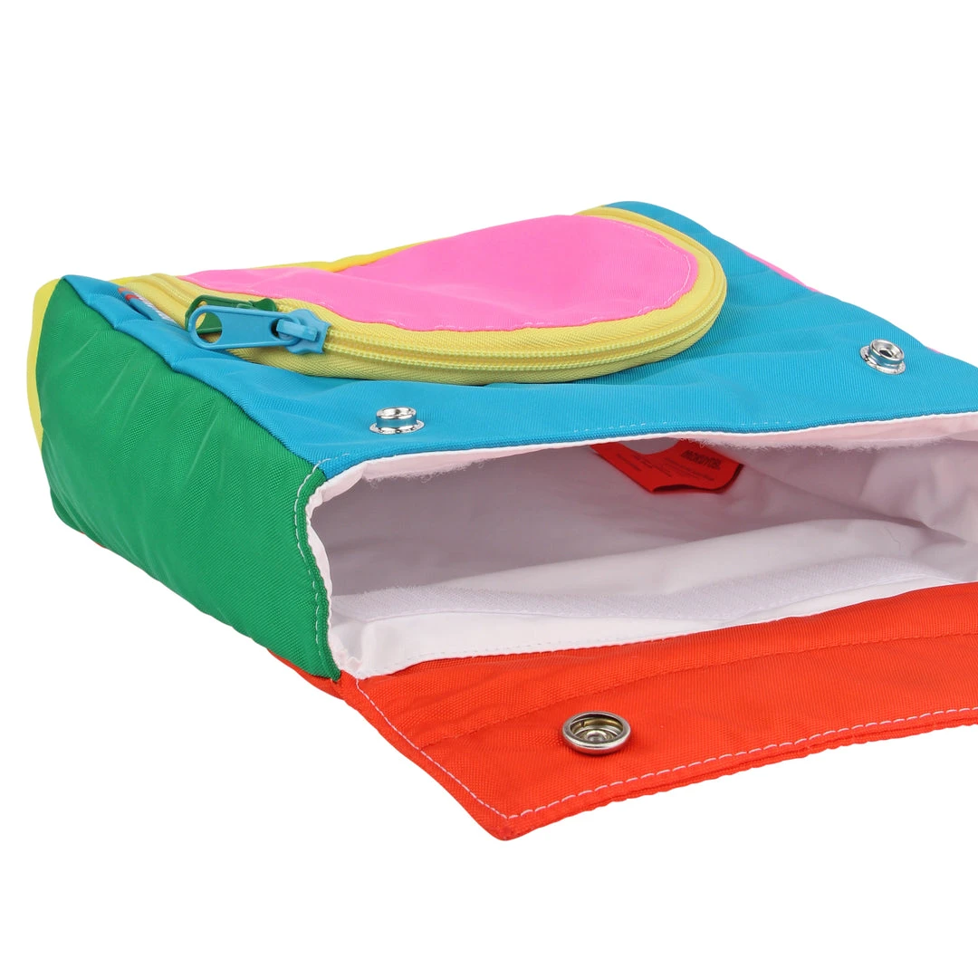 Carry your lunch in style in our rad insulated Lunch Bag! Features an open mouth front double zipper pocket for silverware and any other non refrigerator items. Main compartment has a snap and Velcro closure to keep the cold in. Lined with super slick easy clean lining- just pull out and rinse or wipe down! Top tote handle for easy carrying. Color block triangle side details brings back those old school paper lunch sack vibes. Holds up to 10 pounds of tasty goodness!