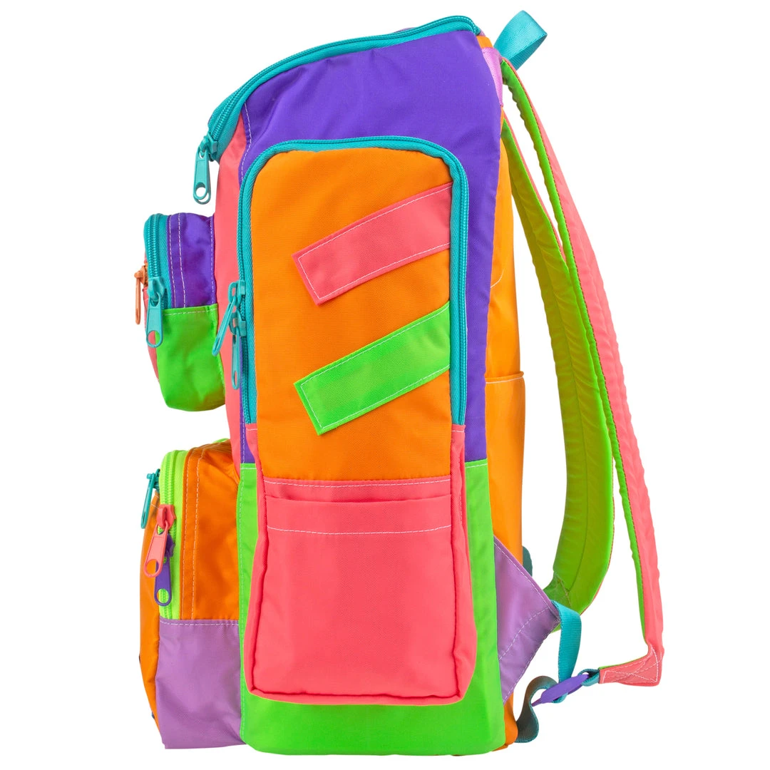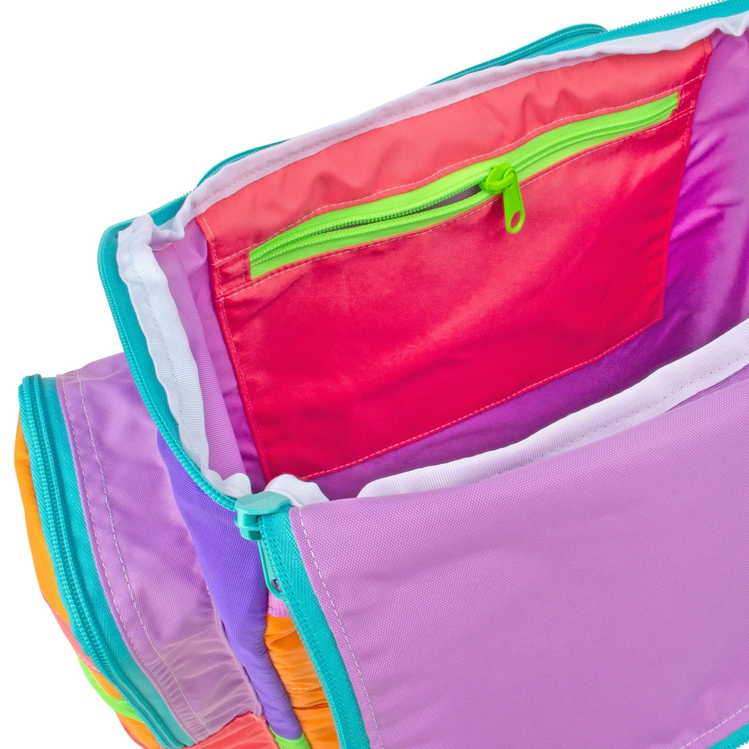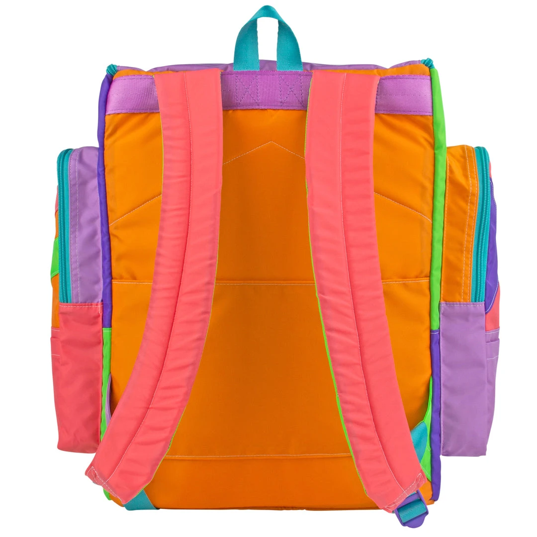 Features 4 separate front zip compartments, two side zip pockets perfect for water bottles or umbrellas and open flat pockets for small items. The padded laptop sleeve in the main compartment fits up to 17″ laptops. Interior zip pocket for stashing valuables. Back suitcase handle anchor for easy travel use, just slide on and go! Foam walls for added structure and insulation.