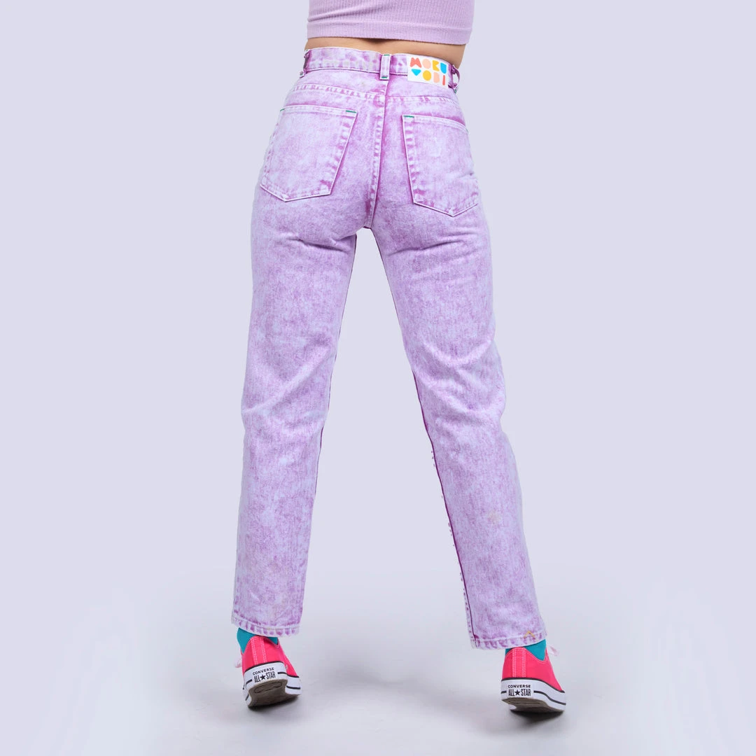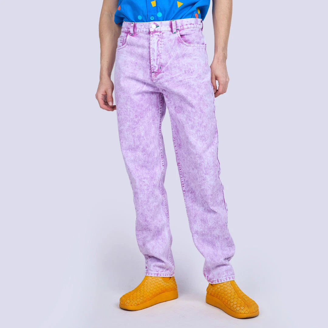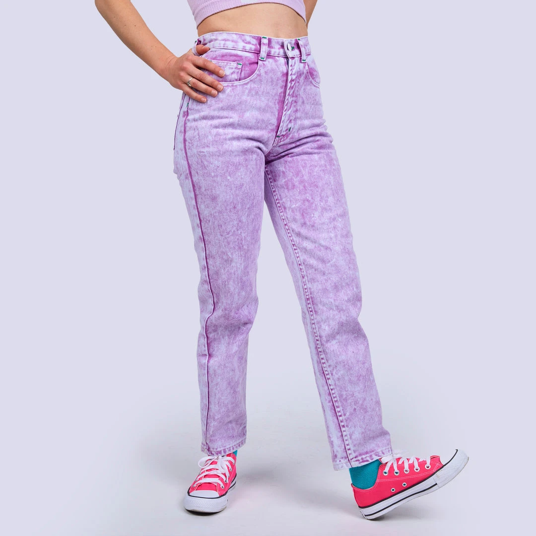 Wow! Look amazing in these rad acid wash jeans in 6 vibrant colors, a modern take on a classic! A flattering unisex silhouette that will be a coveted addition to your wardrobe rotation. Prepare to turn heads in this mid-rise style with a straight tapered leg. Features two deep front pockets and two back patch pockets with a graphic rubber back waistband logo label.