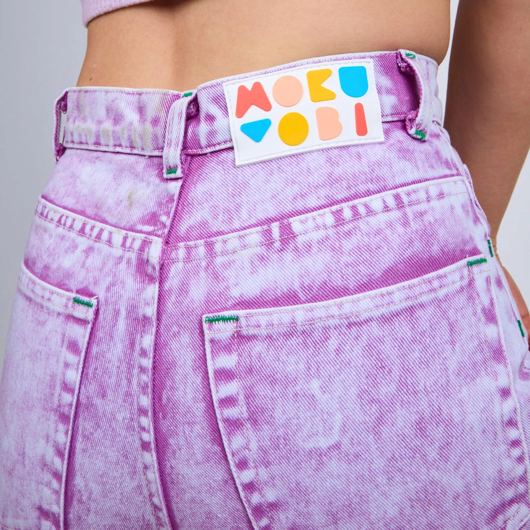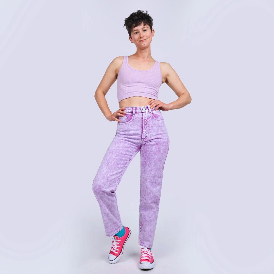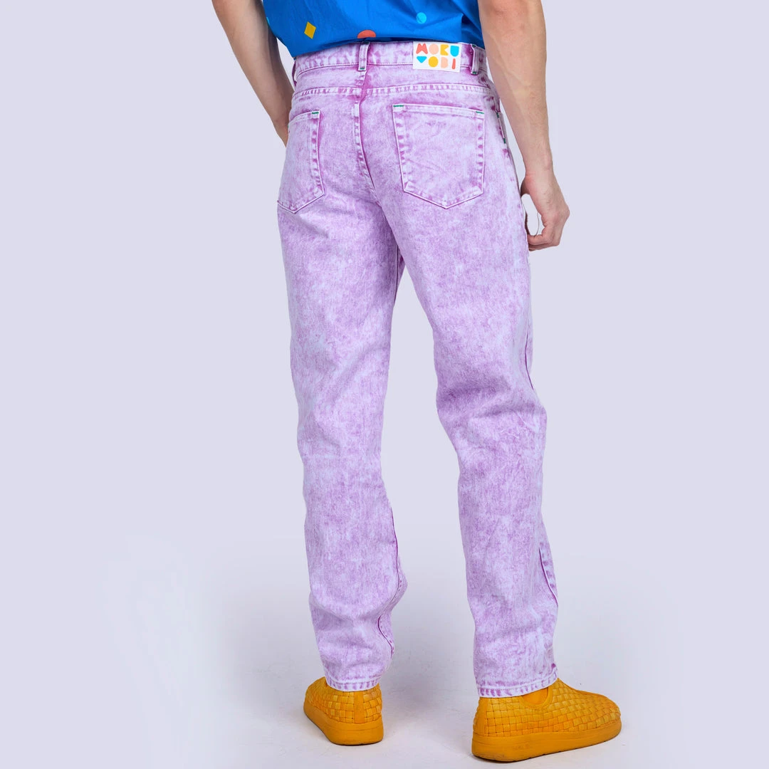 Wow! Look amazing in these rad acid wash jeans in 6 vibrant colors, a modern take on a classic! A flattering unisex silhouette that will be a coveted addition to your wardrobe rotation. Prepare to turn heads in this mid-rise style with a straight tapered leg. Features two deep front pockets and two back patch pockets with a graphic rubber back waistband logo label.
