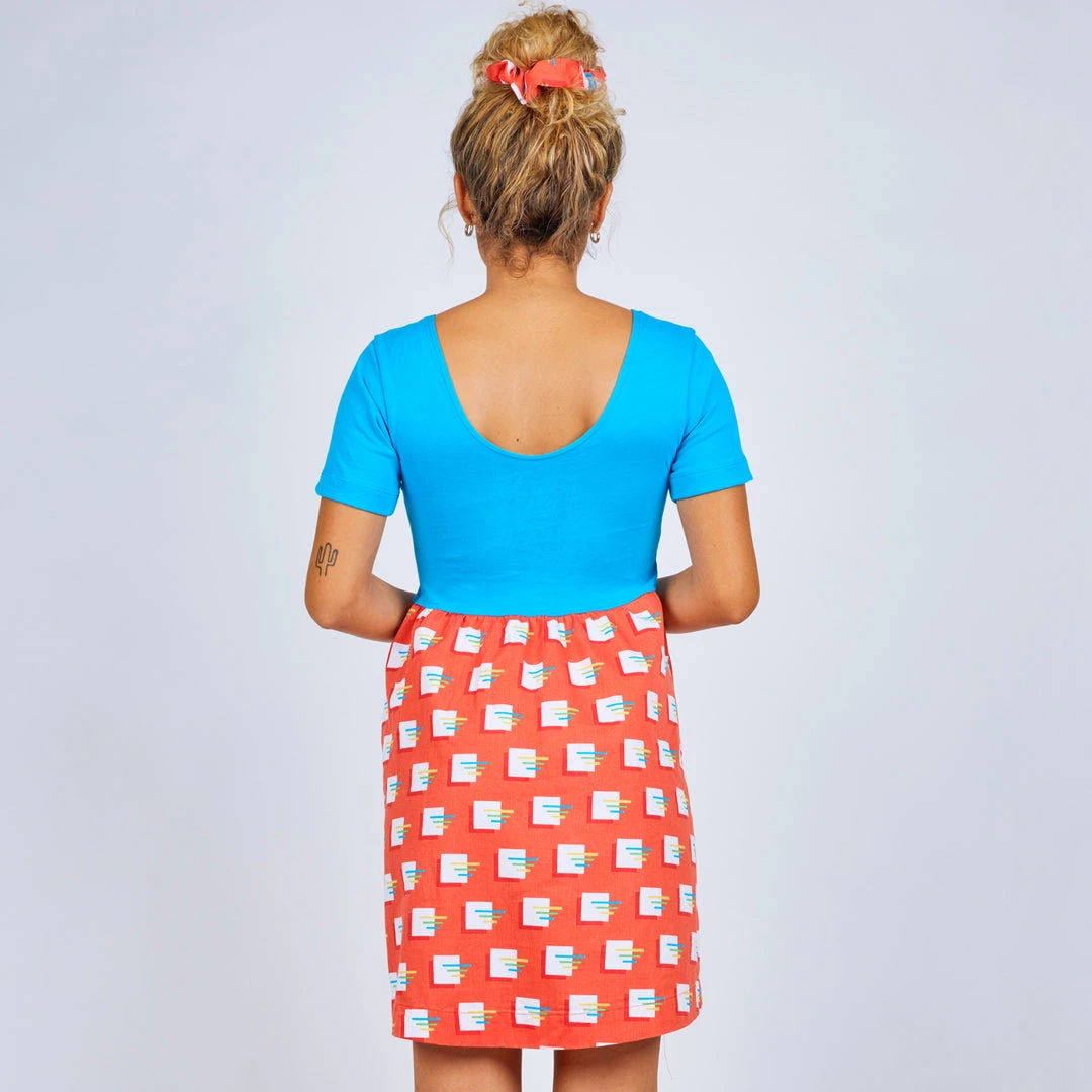 Flattering meets comfortable in this dress style that you’ll find yourself reaching for again and again! Featuring a knit jersey top and allover print full woven skirt that makes this garment feel like a t-shirt dress with a bottom that drapes like a dream and doesn’t cling. Features two side pockets and an invisible side seam zipper to make getting in and out no problem at all.