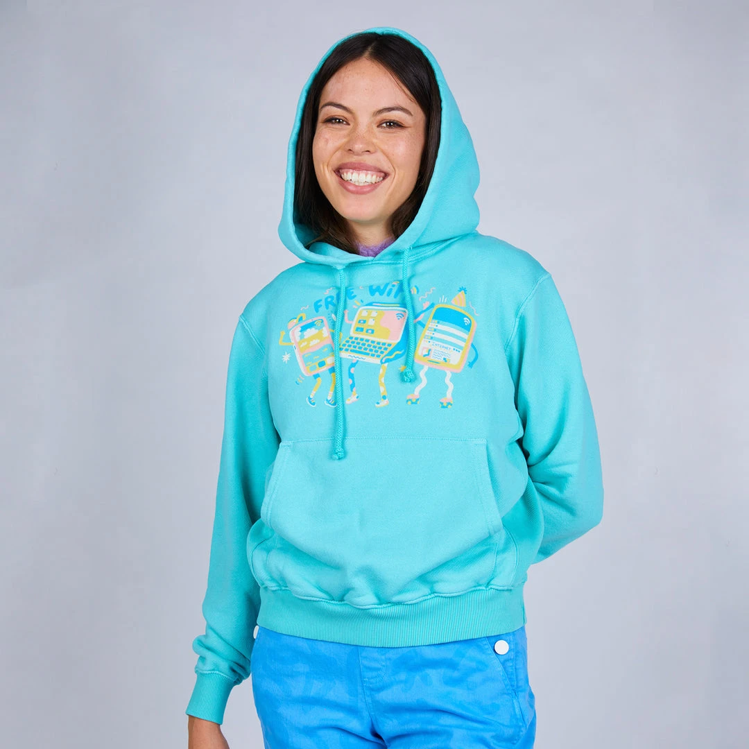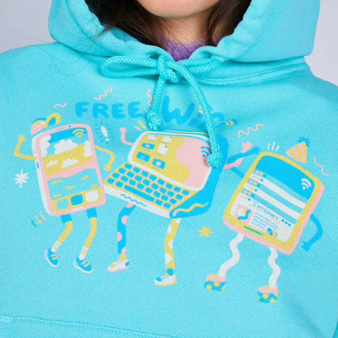 Heavy-weight, super breathable french terry fabric makes this piece the perfect plane outfit, movie theater sweatshirt or anytime you’re looking to get MAX COZY! Garment dyed a fresh mint with a front screen print design to get your devices pumped to find free Wi-fi!