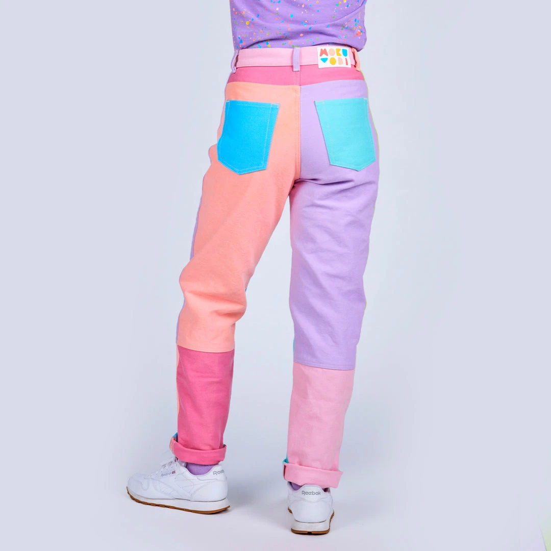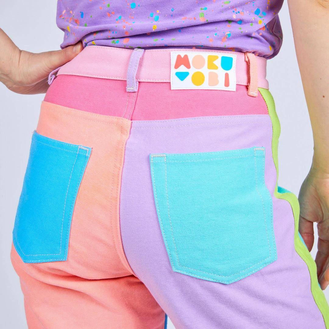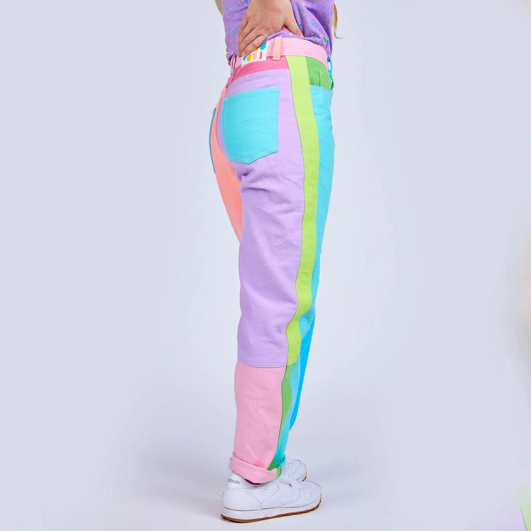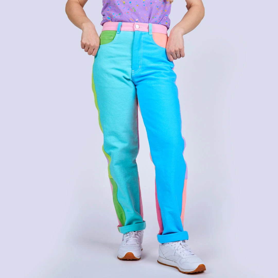 These color block jeans are the definition of totally rad! A flattering unisex silhouette that will be your new must-wear piece. Prepare to turn heads in this mid-rise style with a straight tapered leg. Features two deep front pockets and two back patch pockets with a graphic rubber back waistband logo label. Show off the side stripes and back legs that we split into sections to bring you even more color! Each color was individually piece-dyed and then cut and sewn to create this unbelievably awesome color combo. You will be amazed at how all of the different panels POP on these superstar pastel pants!