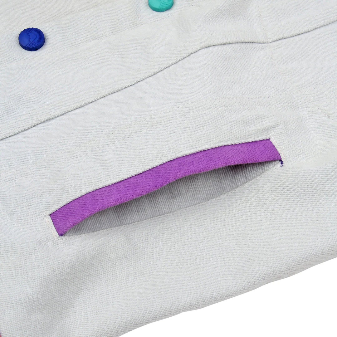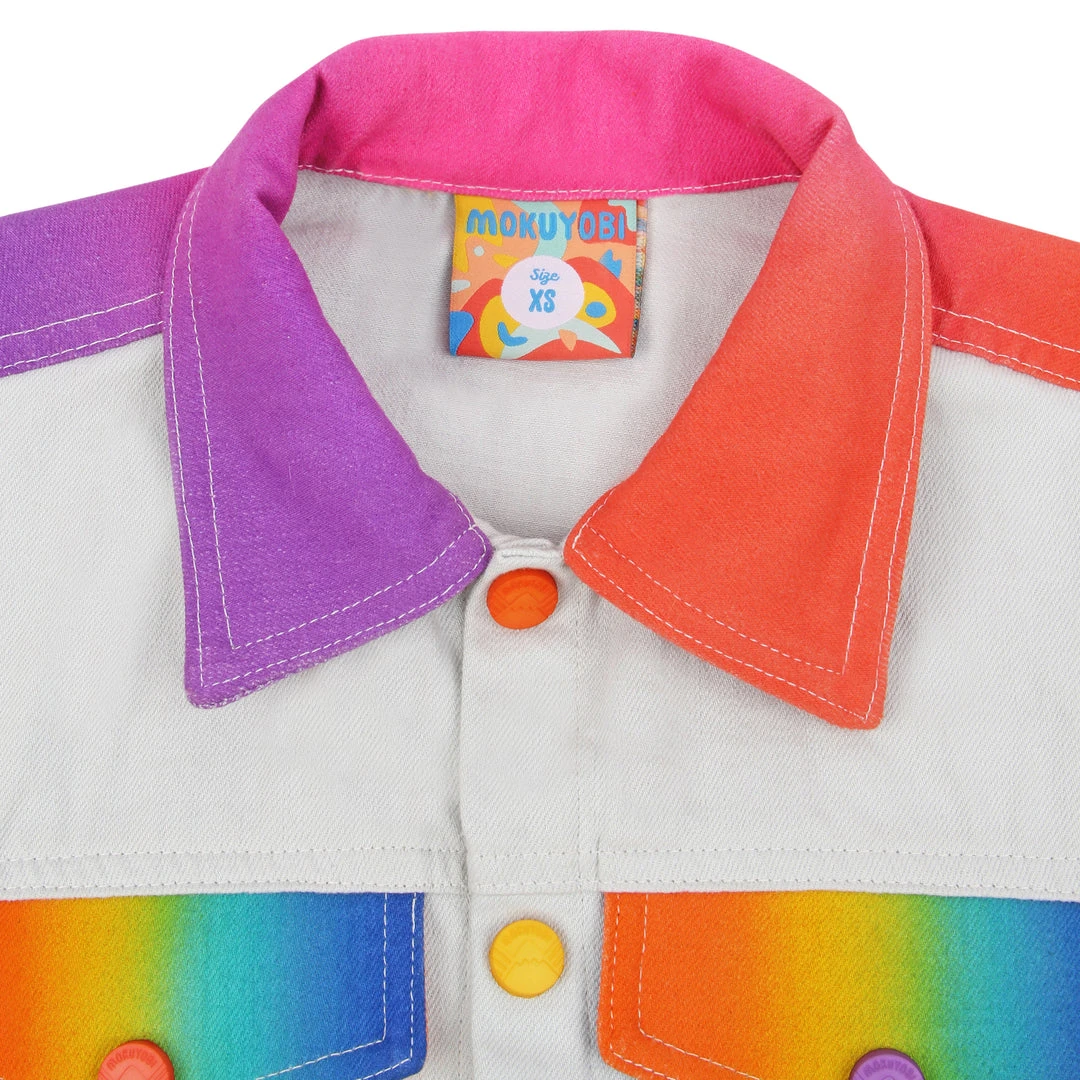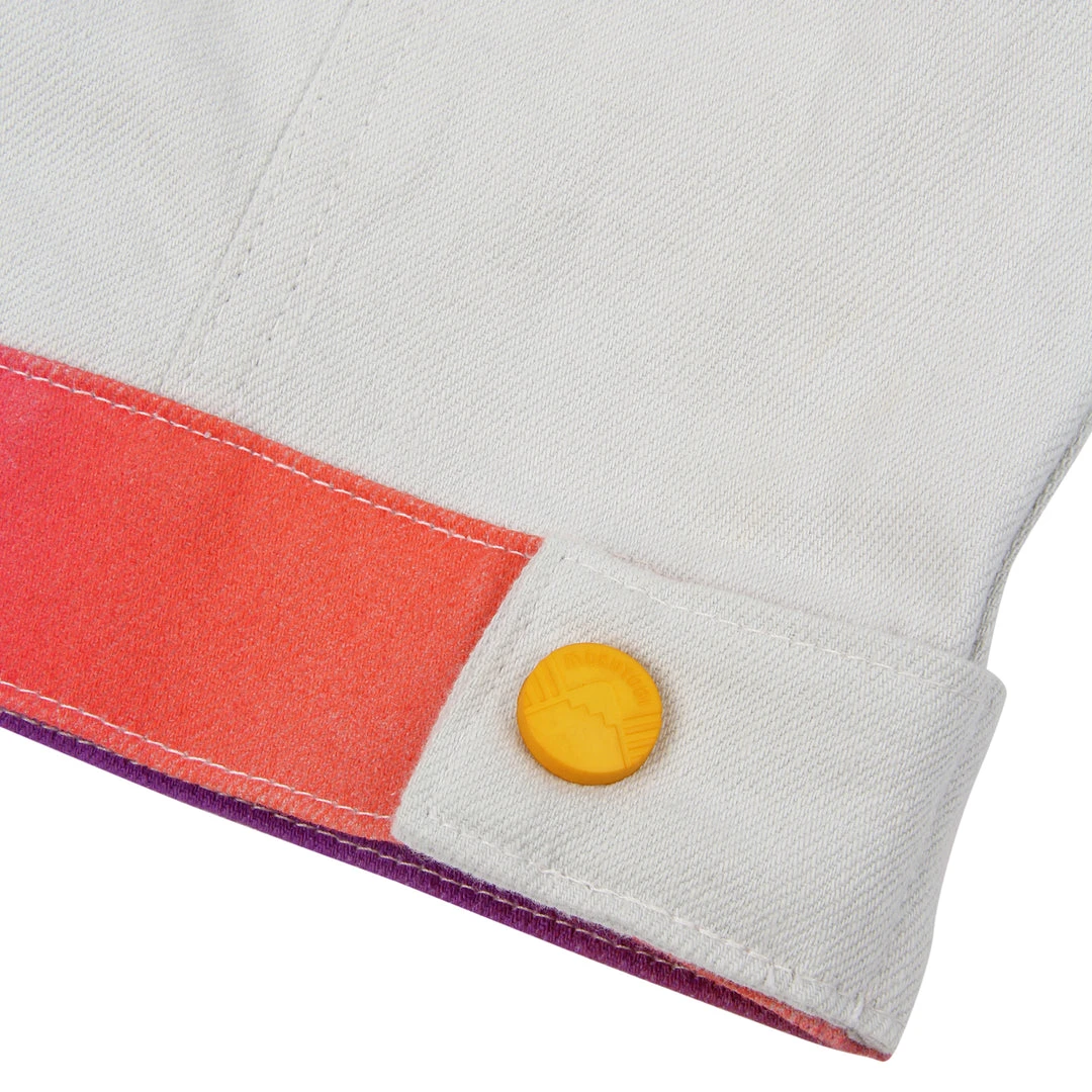 Our airbrush denim jackets are back! Hand airbrushed by piece for an amazing spectrum blend effect with a contrast solid light grey dyed base. Features two front welt pockets, two chest snap flap pockets, and inside pockets with illustrated tag!