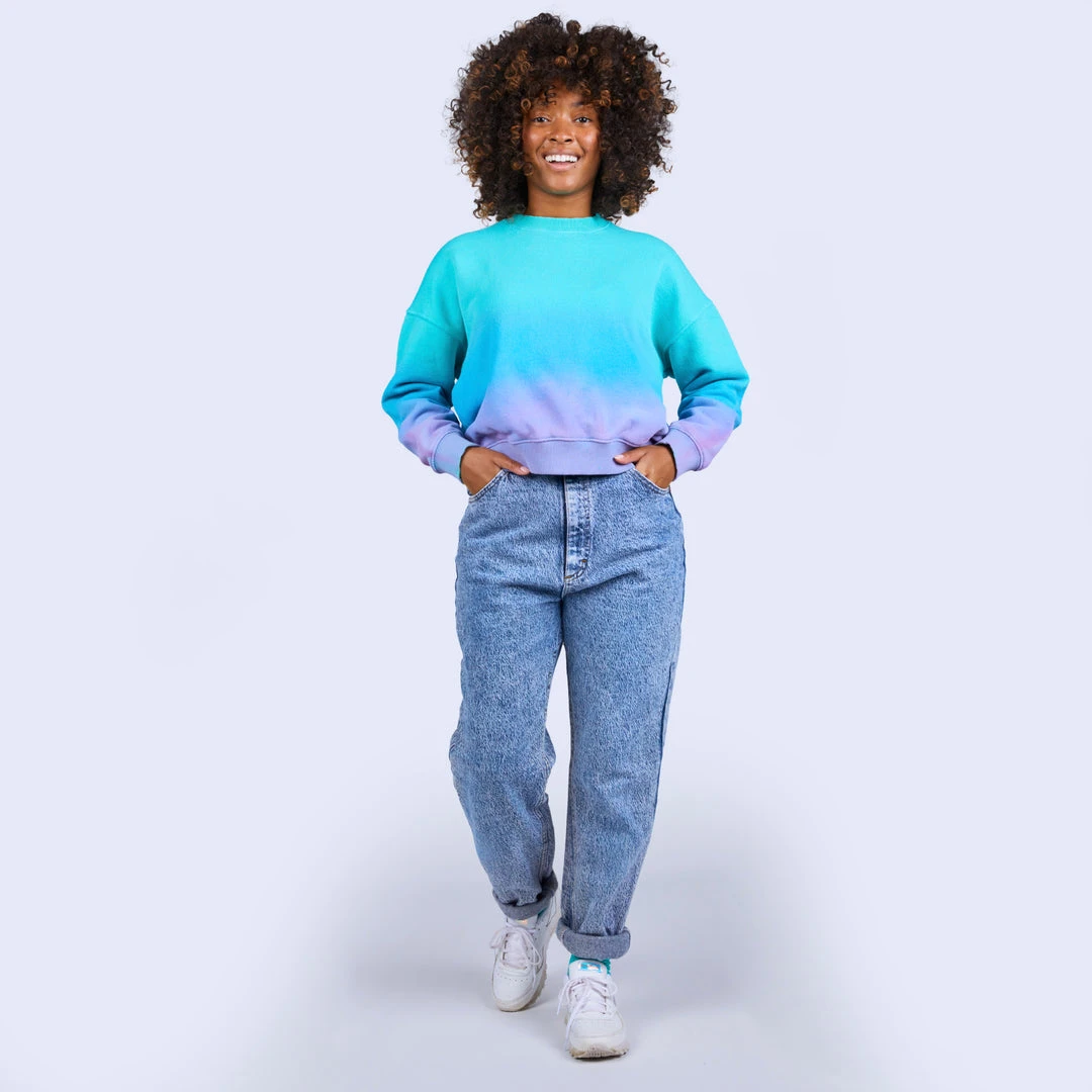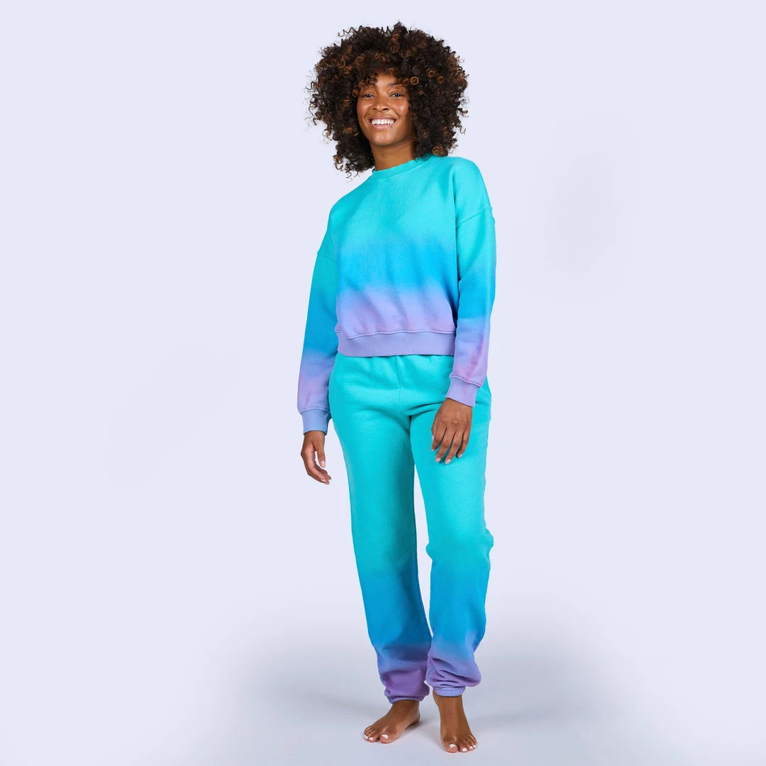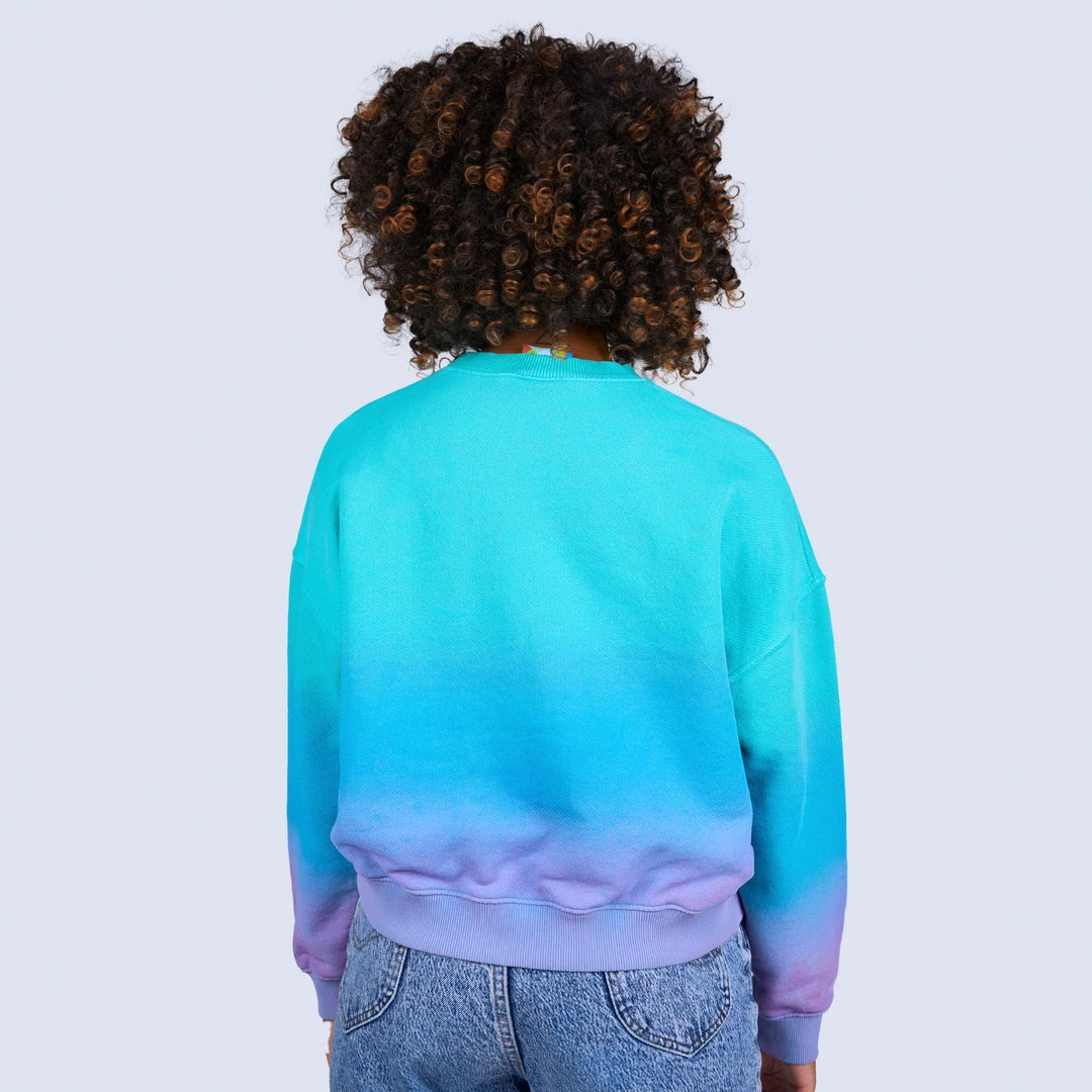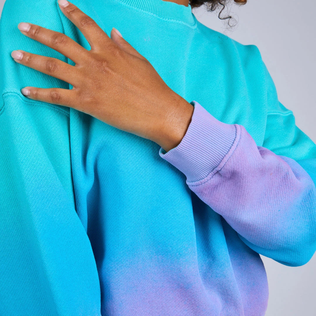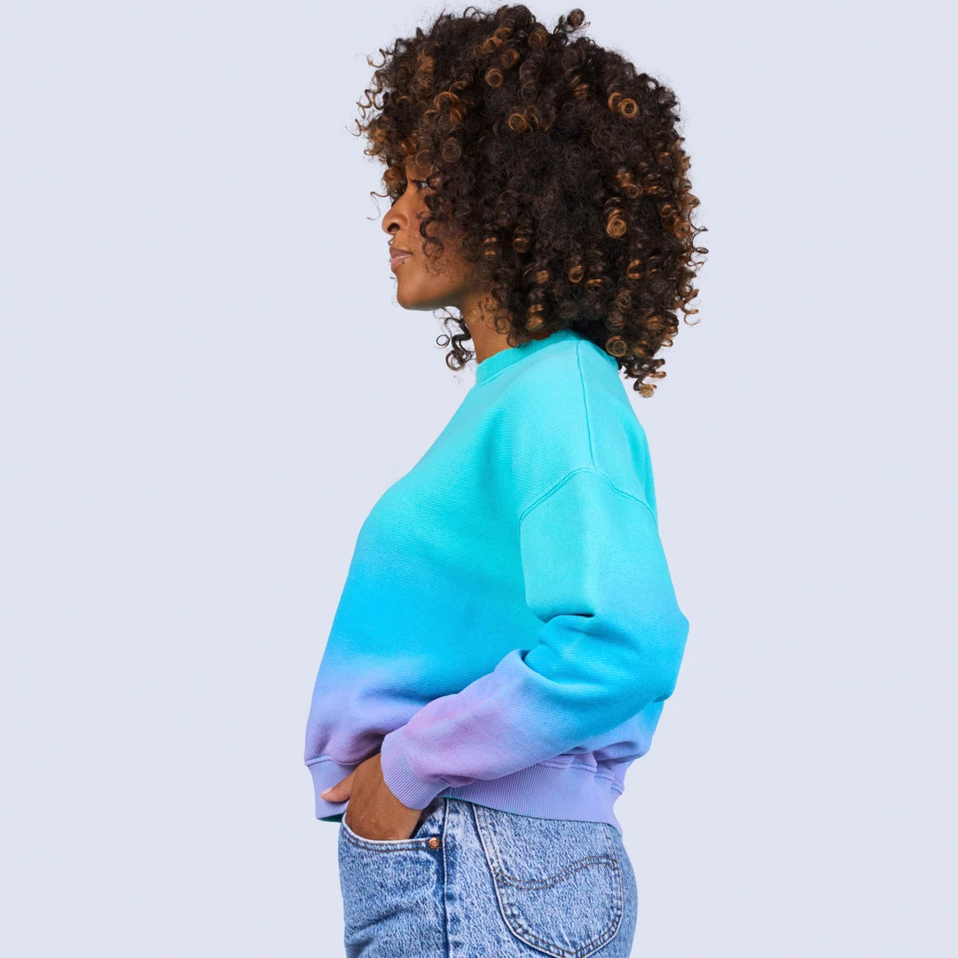 Looking for an easy layer no matter the season? This Crew Sweatshirt is super cozy and ready for action. It has a boxy fit with a drop shoulder and a slightly cropped hem. Features a subtle allover abstract Zap print and cool gradient process that makes this set pop! Each sweatshirt is individually cut, sewn, and dyed all in Los Angeles.