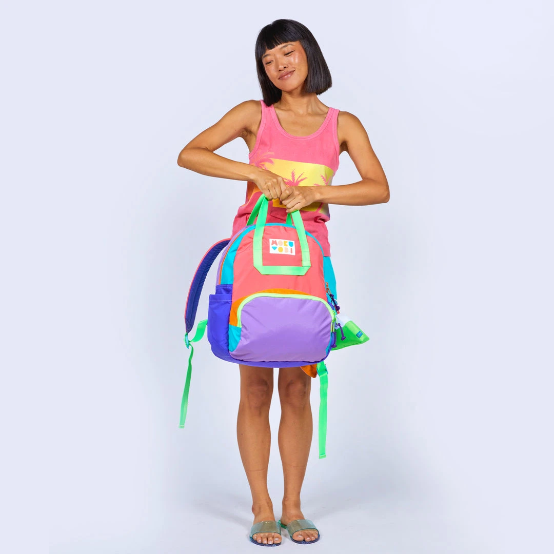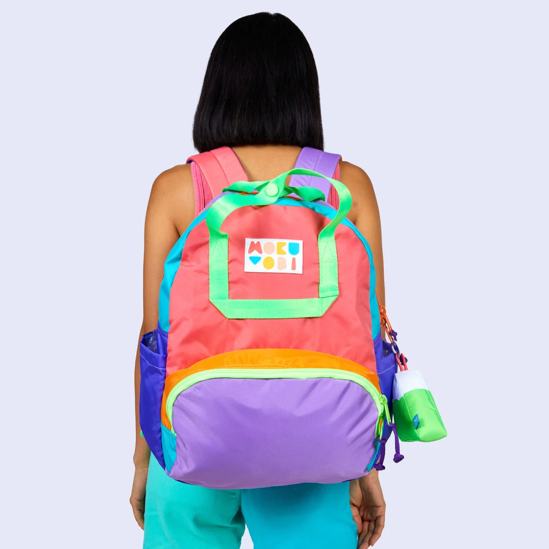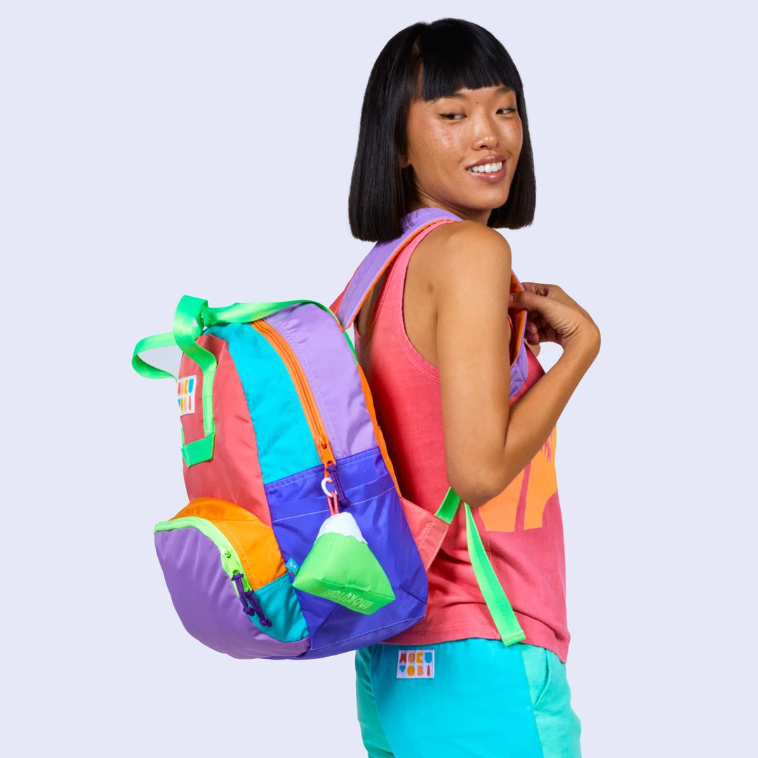 The ultimate go-to style. Mid-size backpack with a large wide-open zip pocket with and a water bottle pocket on both sides. Webbing tote handles featuring easy grab front and back strap with matching logo snap. Inside zipper pocket and back suitcase handle sleeve for easy travel. Adjustable padded back straps with no fail construction. Zip main compartment with solid paracord pulls. Inside padded sleeve fits up to 15″ laptop. Match rubber logo label. Coordinating mountain plush keychain included!
