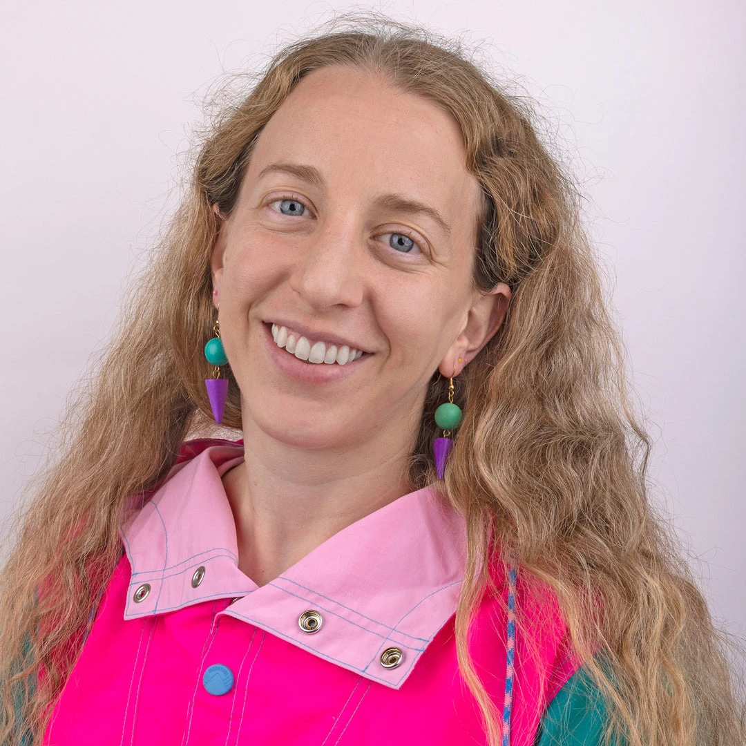 We uncovered hundreds of one of a kind vintage dead stock earrings from the 1980s. This pair is made of wood with a dangling circle and cone shape.