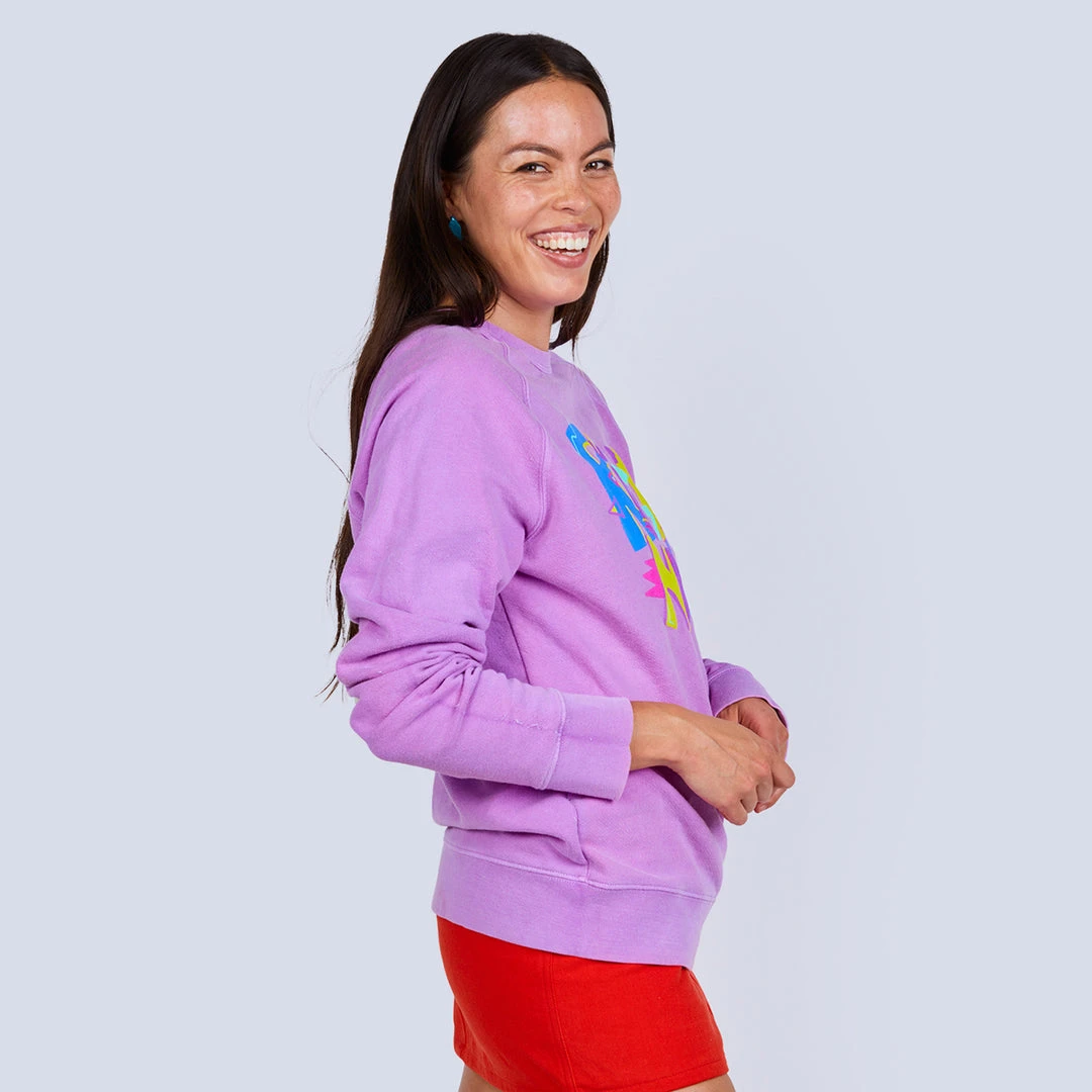 Looking for an easy layer no matter the season? You’ve come to the right place. This playful crew sweatshirt is super cozy and ready for action. Each sweatshirt is individually cut, sewn, dyed, and screen printed. This graphic has elements printed using SUPER PUFF ink for a fun texture!