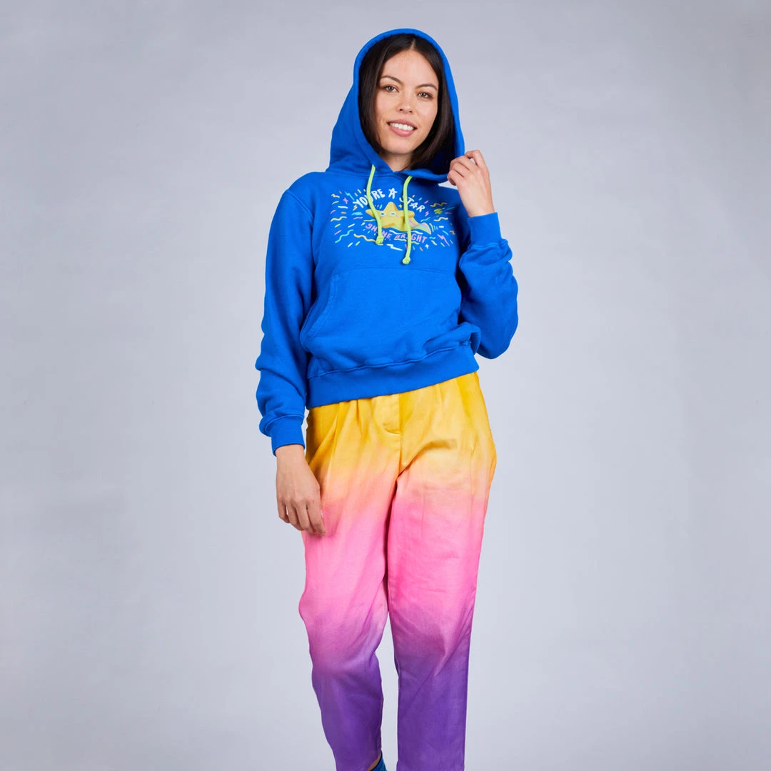 Heavy-weight, super breathable french terry fabric makes this piece the perfect plane outfit, movie theater sweatshirt or anytime you’re looking to get MAX COZY! Garment dyed a rich royal blue with a front screen print design to help you shine bright!
