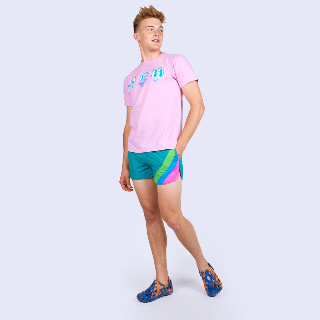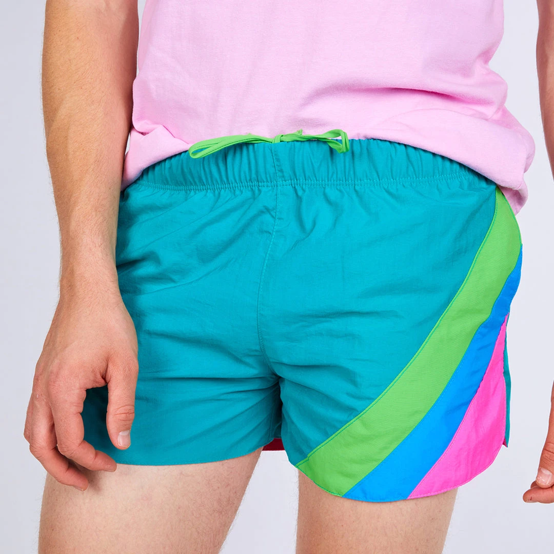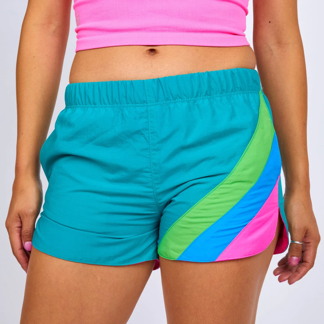 Keep it casual in this ever ready mid-rise Summer Short! Constructed with 100% nylon with a color block stripe detail- giving these shorts a vintage swim trunk vibe re-imagined as a daily style. Features two side pockets, two back double welt pockets with color block detail, and an interior drawstring. These bottoms are great as a beach cover up or a casual bottom. Keep it breezy!