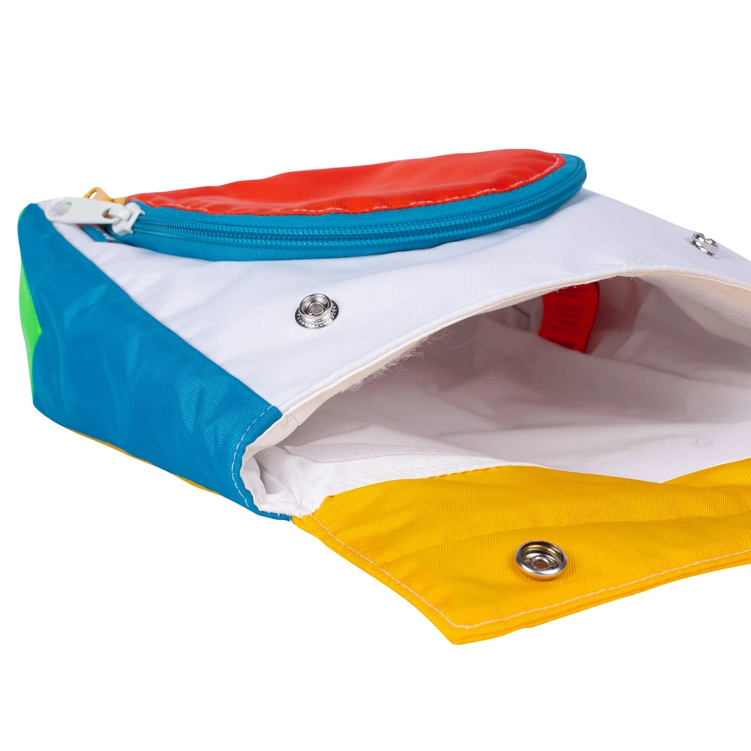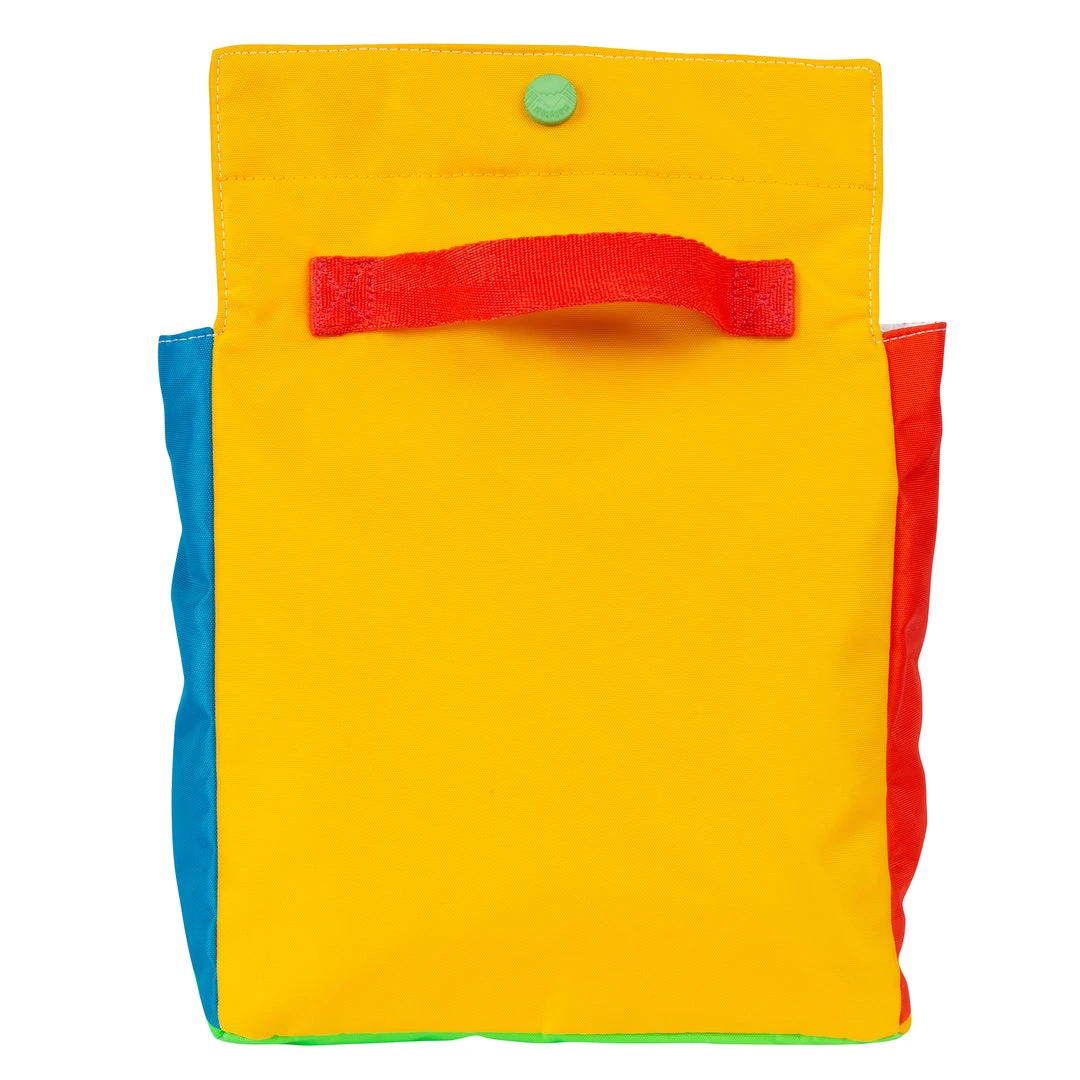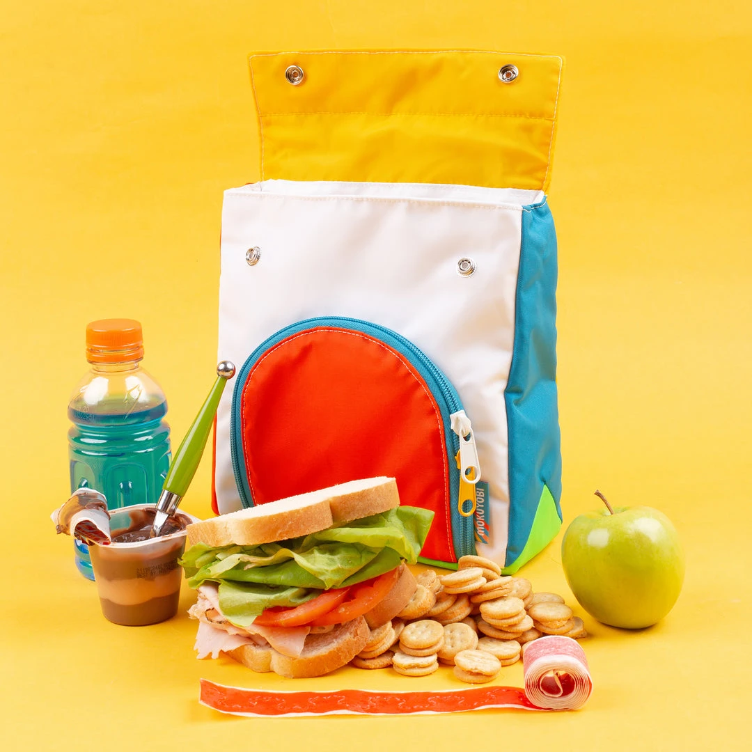 Carry your lunch in style in our rad insulated Lunch Bag! Features an open mouth front double zipper pocket for silverware and any other non refrigerator items. Main compartment has a snap and Velcro closure to keep the cold in. Lined with super slick easy clean lining- just pull out and rinse or wipe down! Top tote handle for easy carrying. Color block triangle side details brings back those old school paper lunch sack vibes. Holds up to 10 pounds of tasty goodness!