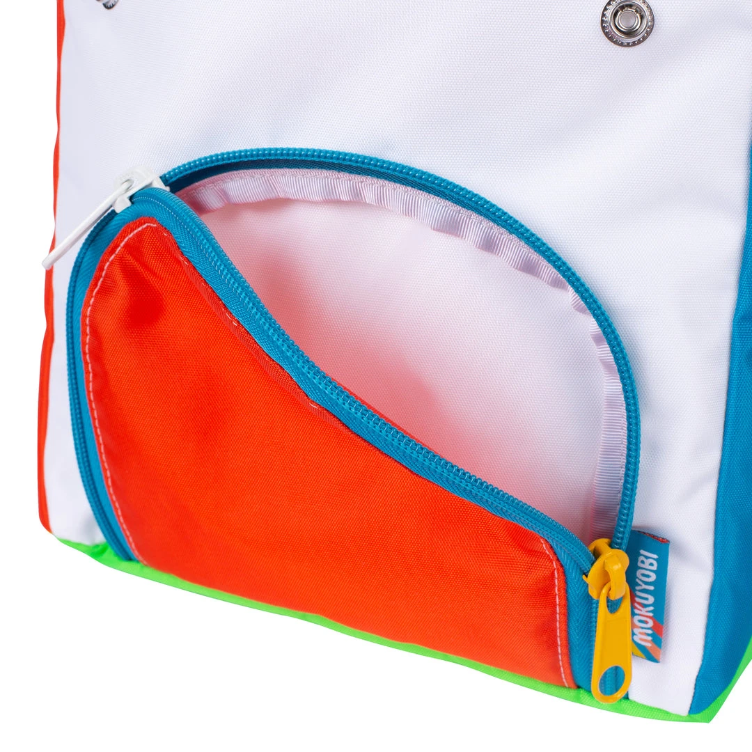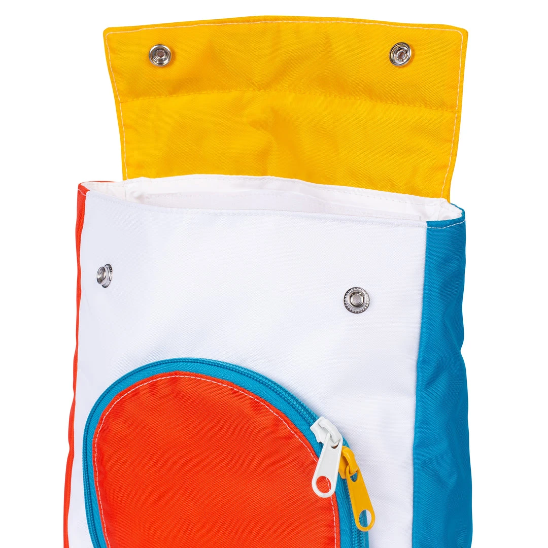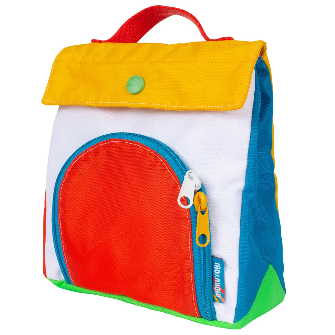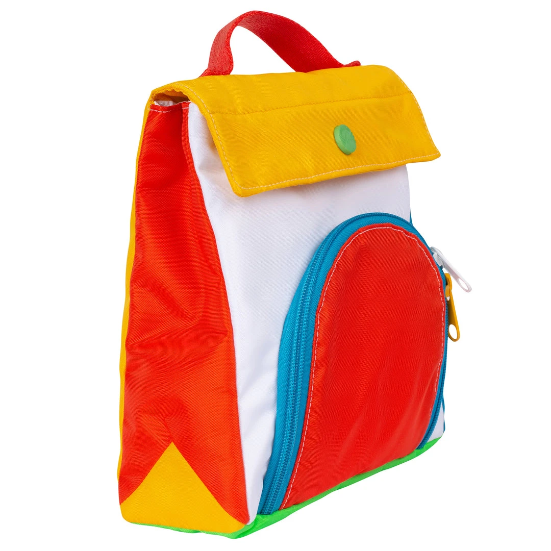 Carry your lunch in style in our rad insulated Lunch Bag! Features an open mouth front double zipper pocket for silverware and any other non refrigerator items. Main compartment has a snap and Velcro closure to keep the cold in. Lined with super slick easy clean lining- just pull out and rinse or wipe down! Top tote handle for easy carrying. Color block triangle side details brings back those old school paper lunch sack vibes. Holds up to 10 pounds of tasty goodness!
