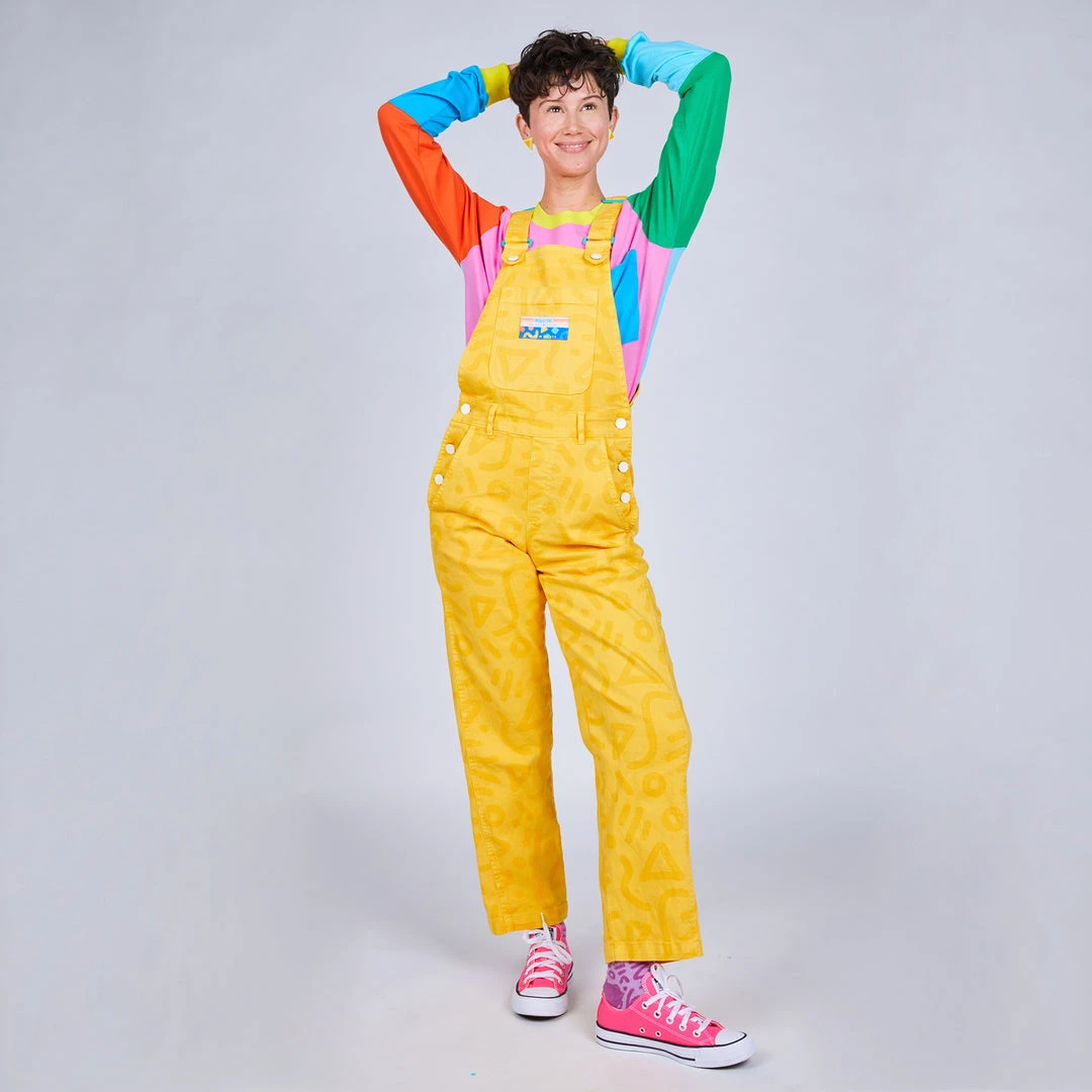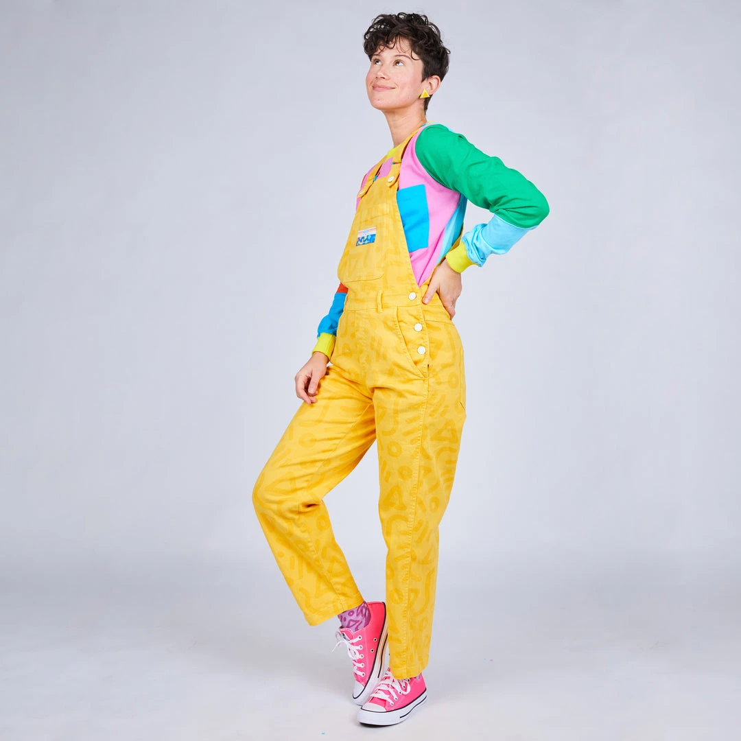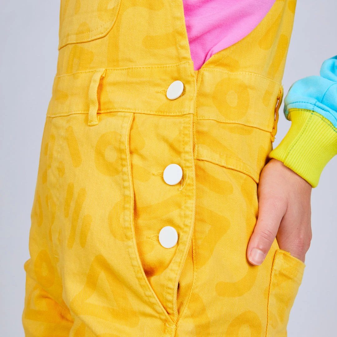 Overalls for all! This totally rad print style with a golden yellow background will have you ready for anything! The stretch fabric make this style super comfortable and easy to move in. Features a large front chest pocket, two front pockets, two back pockets, belt loops, adjustable straps, and secure rubberized tack button closures.