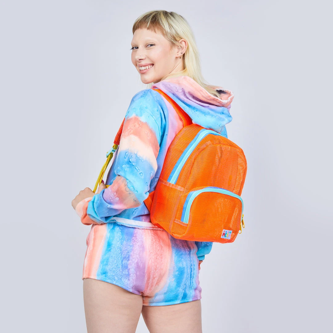 A great sporty style as a daily bag, beach buddy, or festival companion. This small backpack features a large front pocket with double zipper pull and main compartment. Super soft adjustable top loop & webbing.