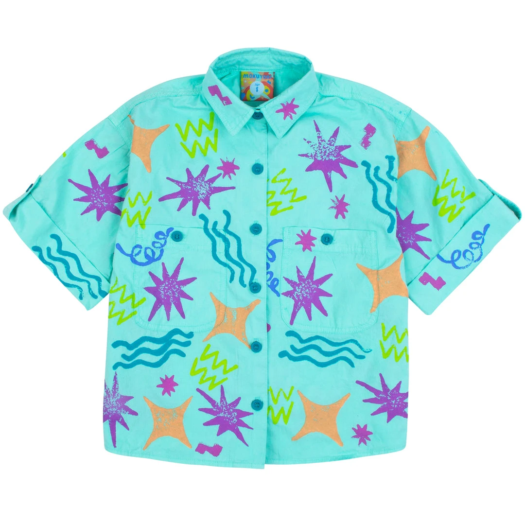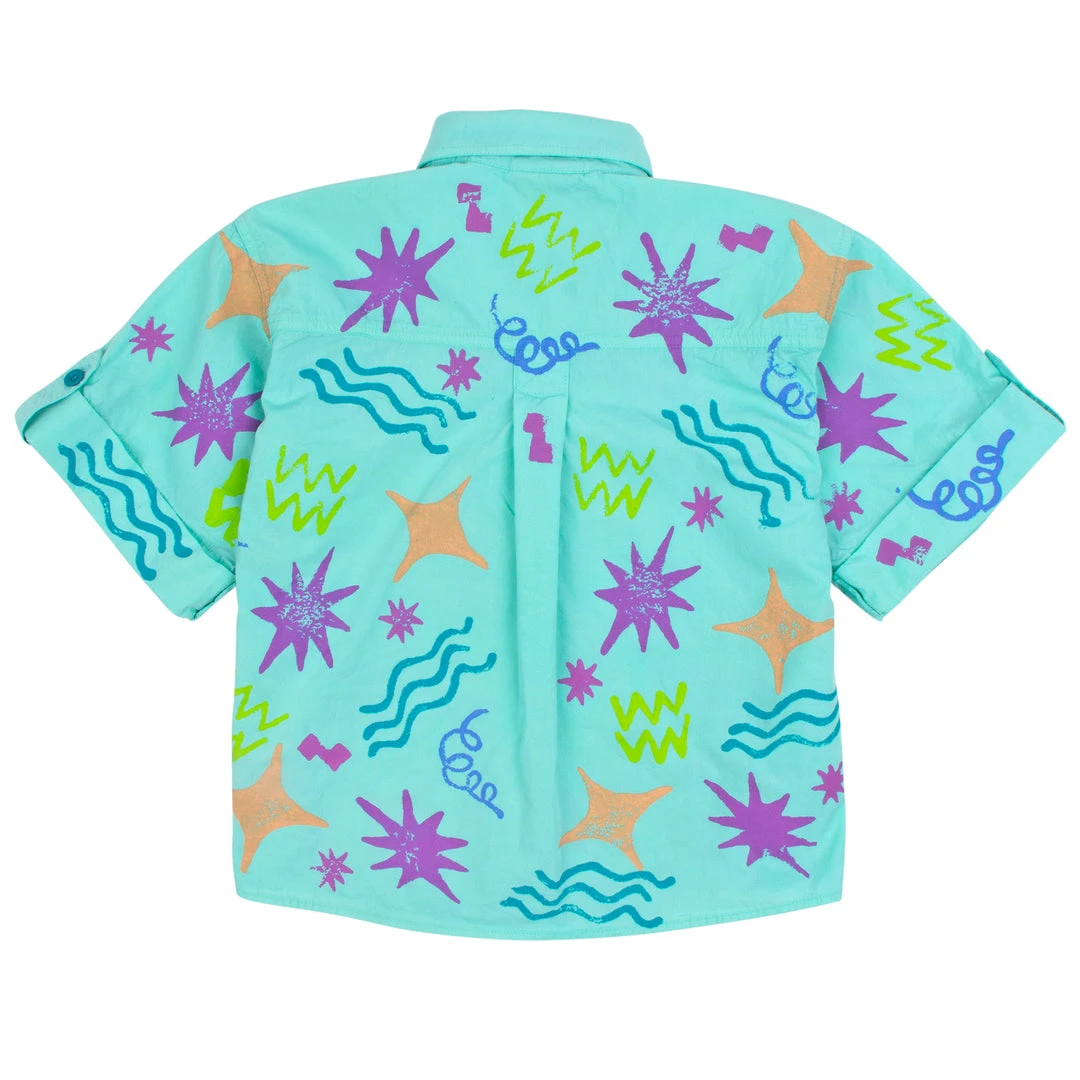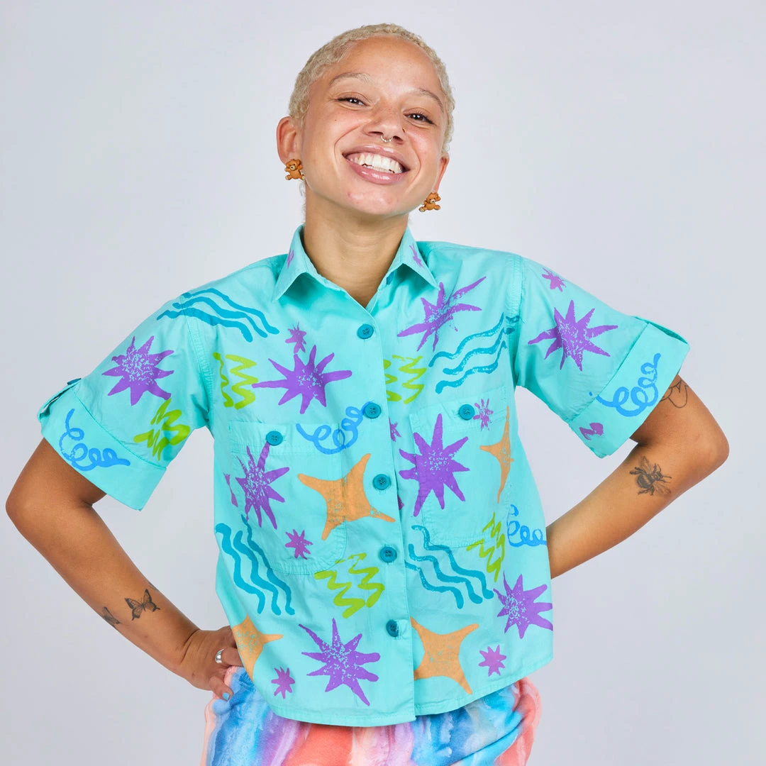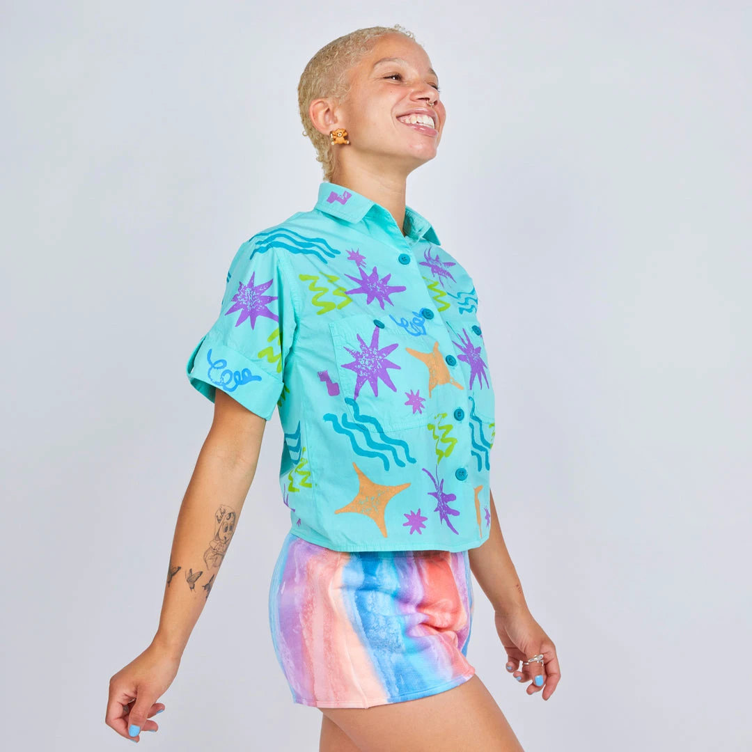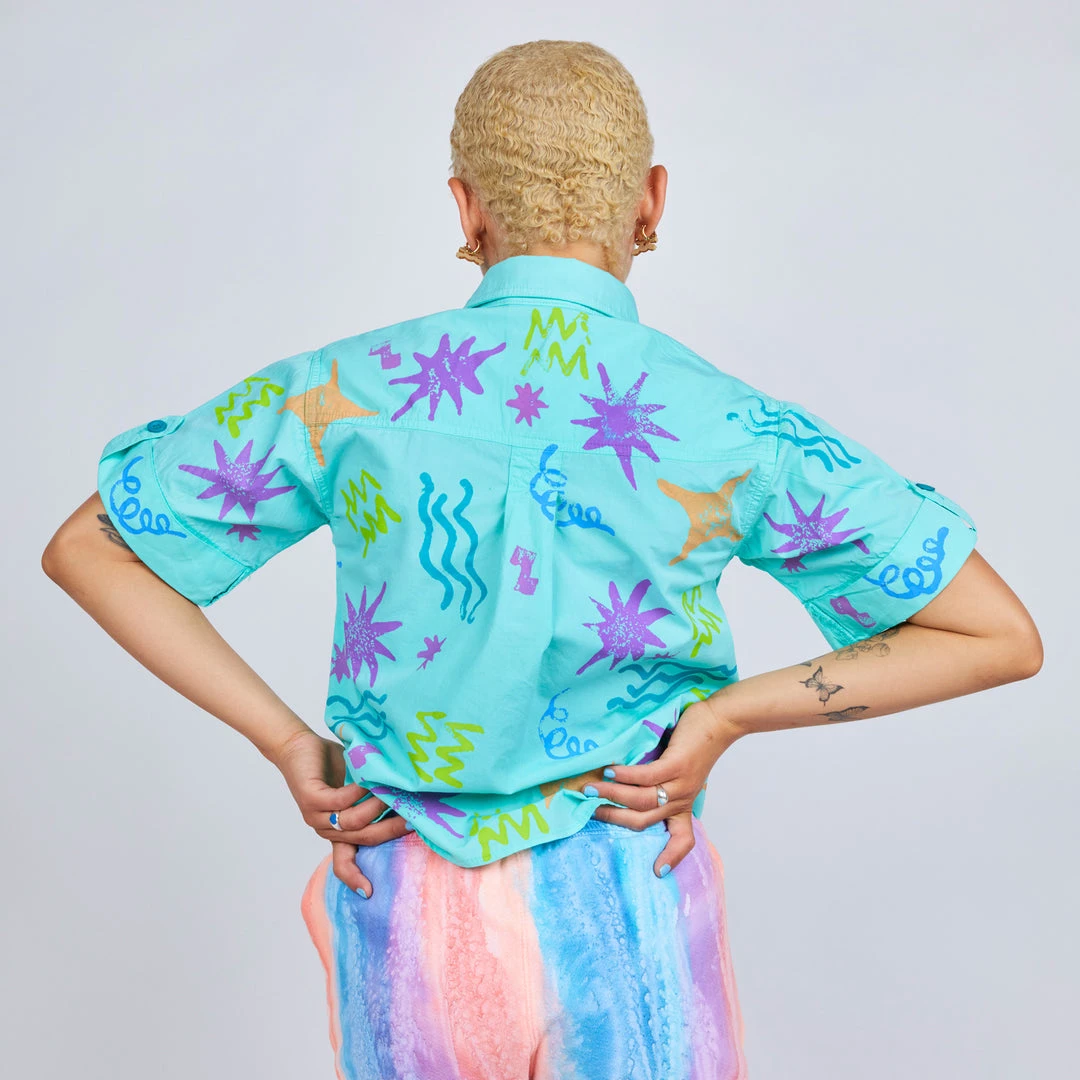 This rad top is a part of our Paint Process Collection and we stamped it with a bunch of wacky multi colored stamps! Each garment is individually cut, sewn, and stamped so the design details of each will be a unique expression that’s just for you!